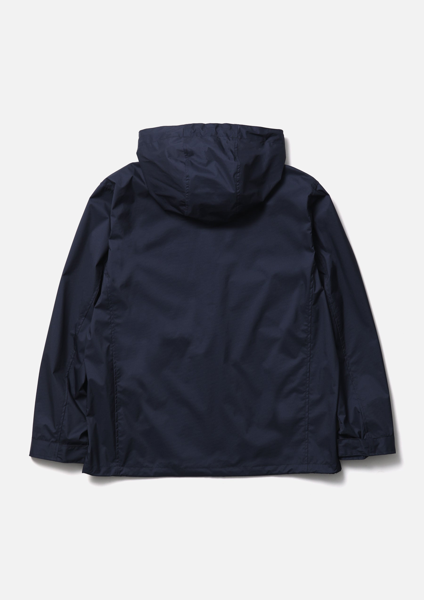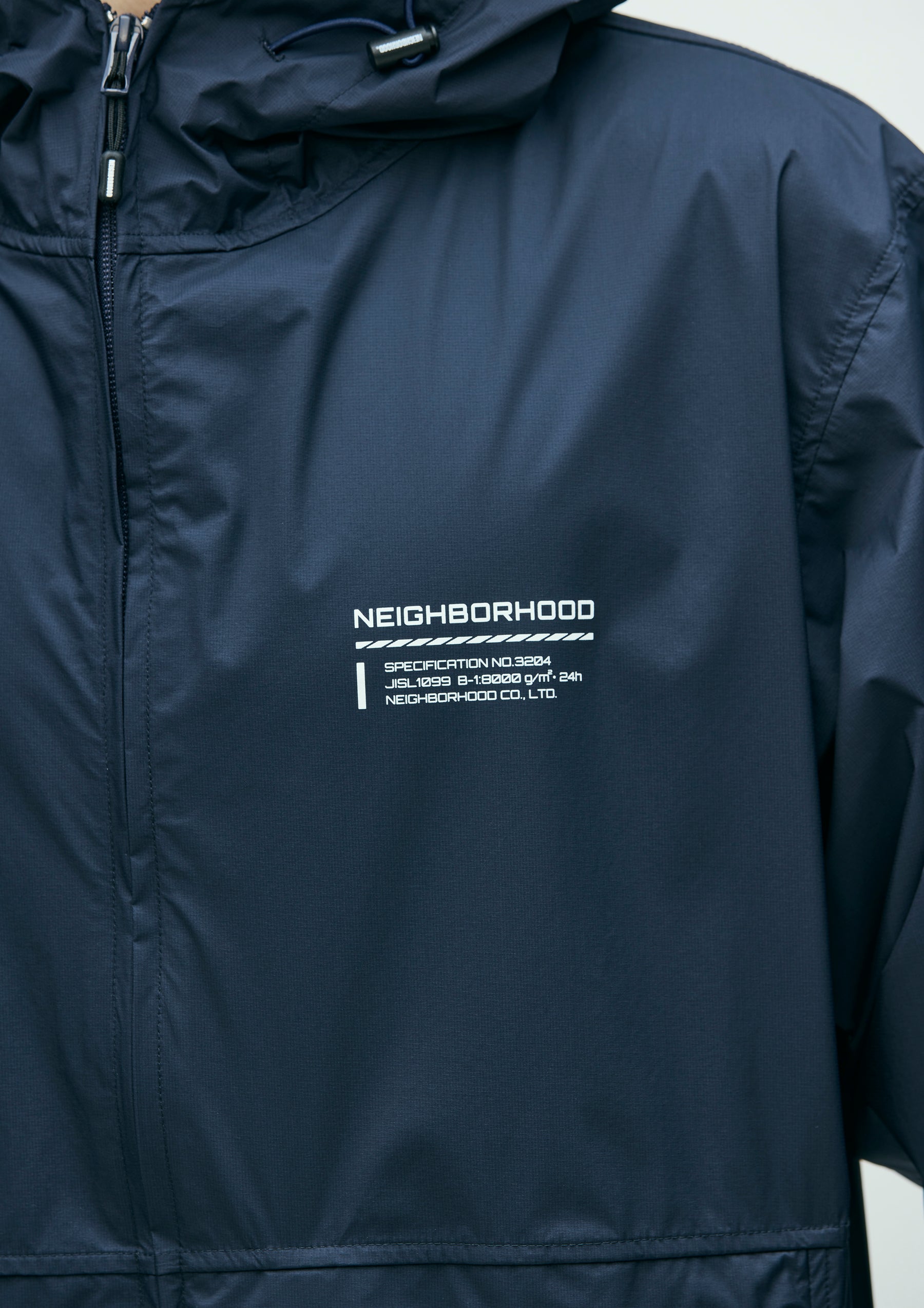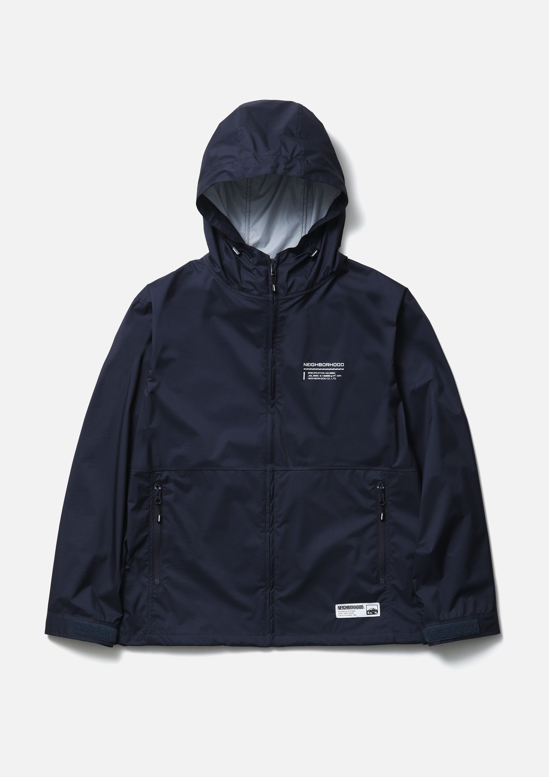 Lightweight packable jacket made from an ultra-thin 3-layer functional fabric that combines waterproof performance with breathability. Features a packable design utilizing the left waist pocket. Equipped with elastic drawcords at the hood and hem, fitted with original stoppers for adjustment. Sleeves are finished with Velcro tabs. A logo is printed on the left chest. A brand tag is placed at the left hem, and a woven side label is attached at the side seam.
