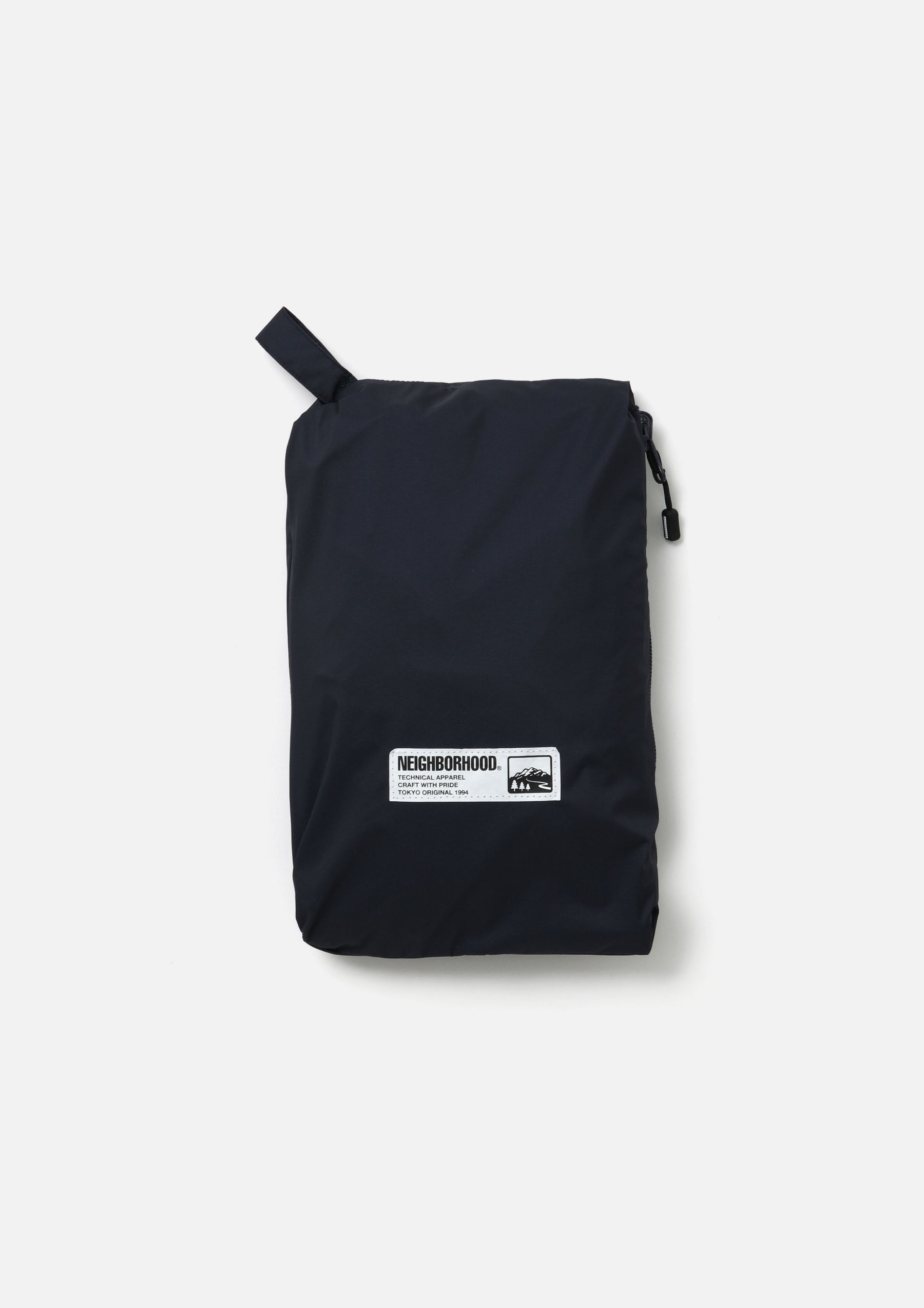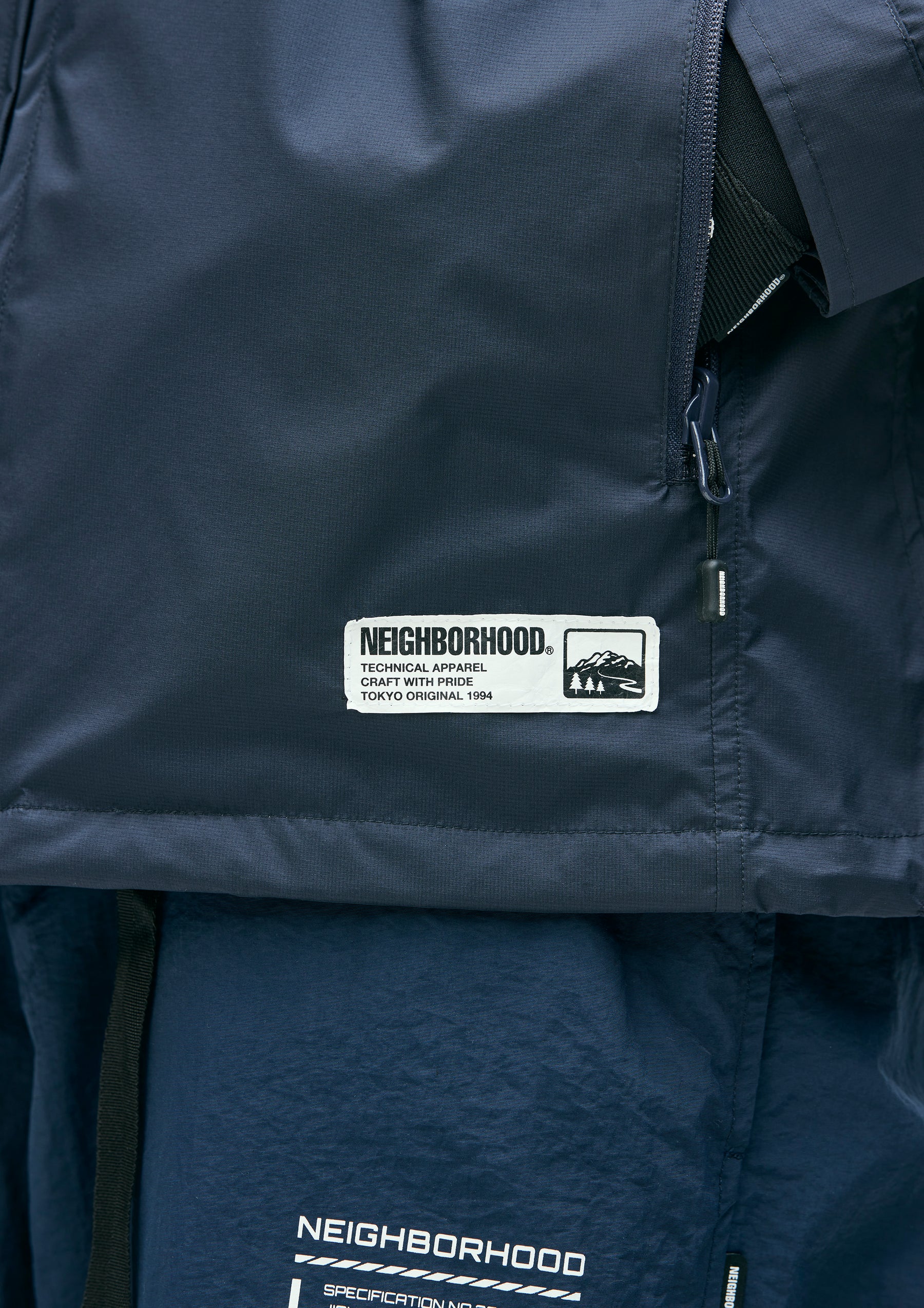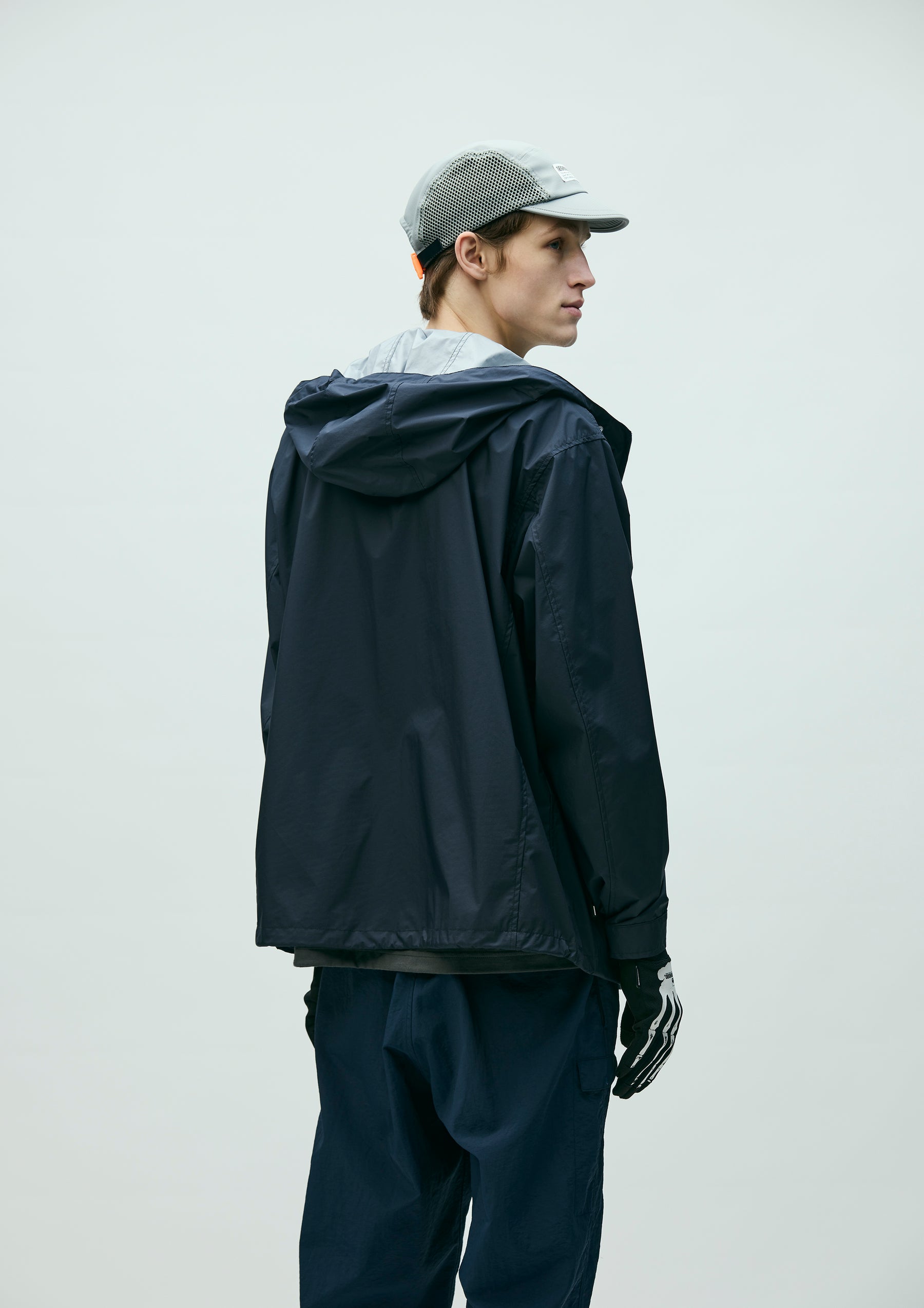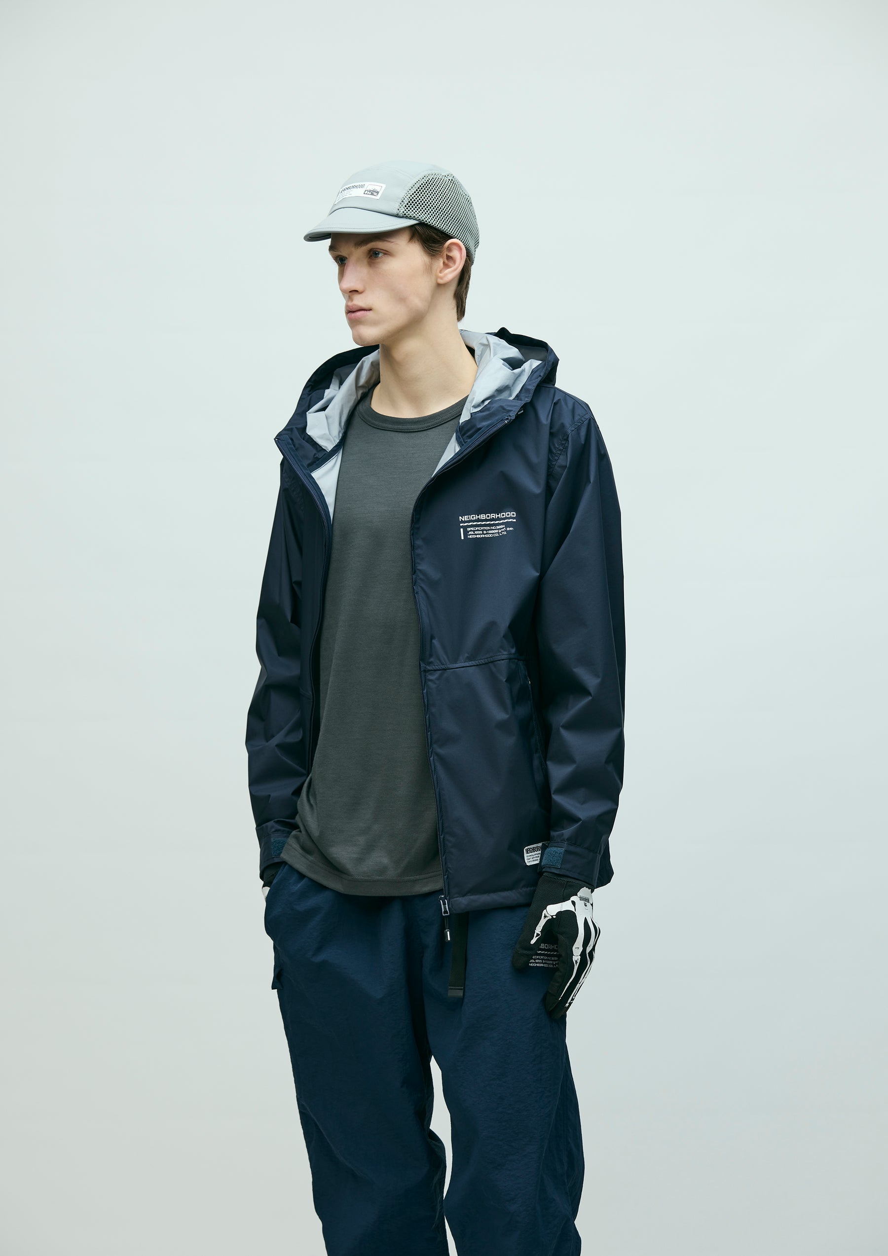 Lightweight packable jacket made from an ultra-thin 3-layer functional fabric that combines waterproof performance with breathability. Features a packable design utilizing the left waist pocket. Equipped with elastic drawcords at the hood and hem, fitted with original stoppers for adjustment. Sleeves are finished with Velcro tabs. A logo is printed on the left chest. A brand tag is placed at the left hem, and a woven side label is attached at the side seam.