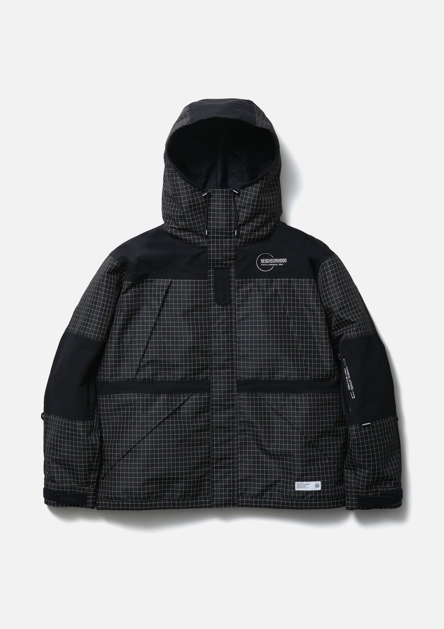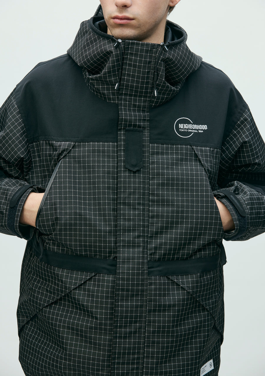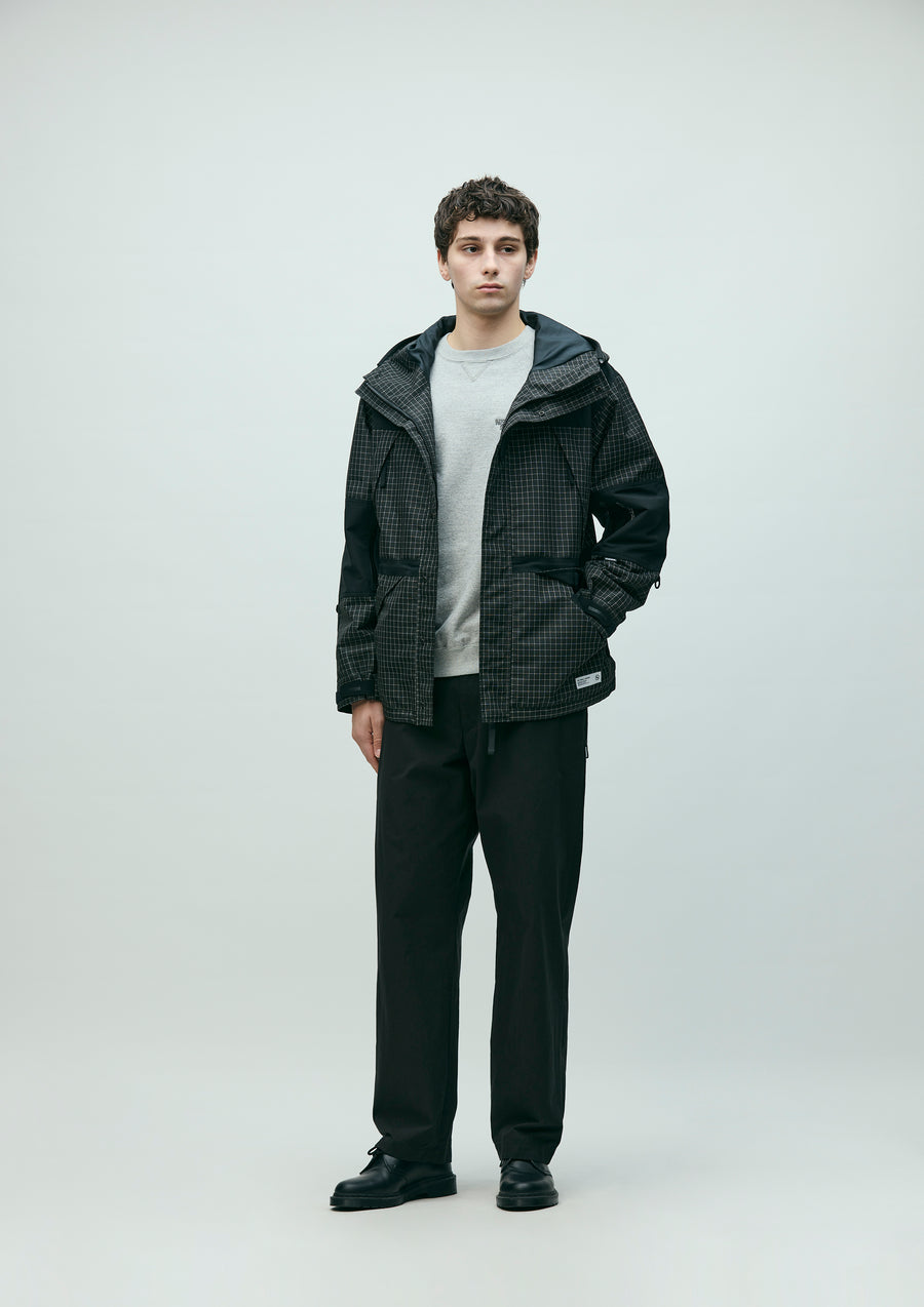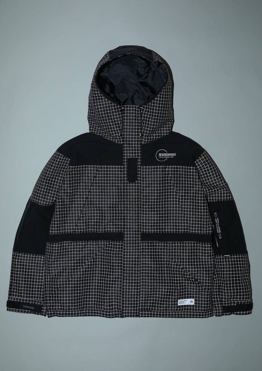 Mountain parka made from original reflective ripstop material. The textile incorporates reflector yarn for high visibility, with a water-repellent finish on the surface and an acrylic coating on the reverse side to ensure durability, water resistance, and safety. Features four waterproof zip pockets on the front body and sleeves. Finished with original Velcro tabs at the cuffs, and elastic drawcords with adjusters at the hood, waist, and hem. Logos are embroidered on the left chest and left sleeve. A brand tag is placed at the left hem, and a woven side label is attached to the left sleeve. Lined with antistatic polyester taffeta.