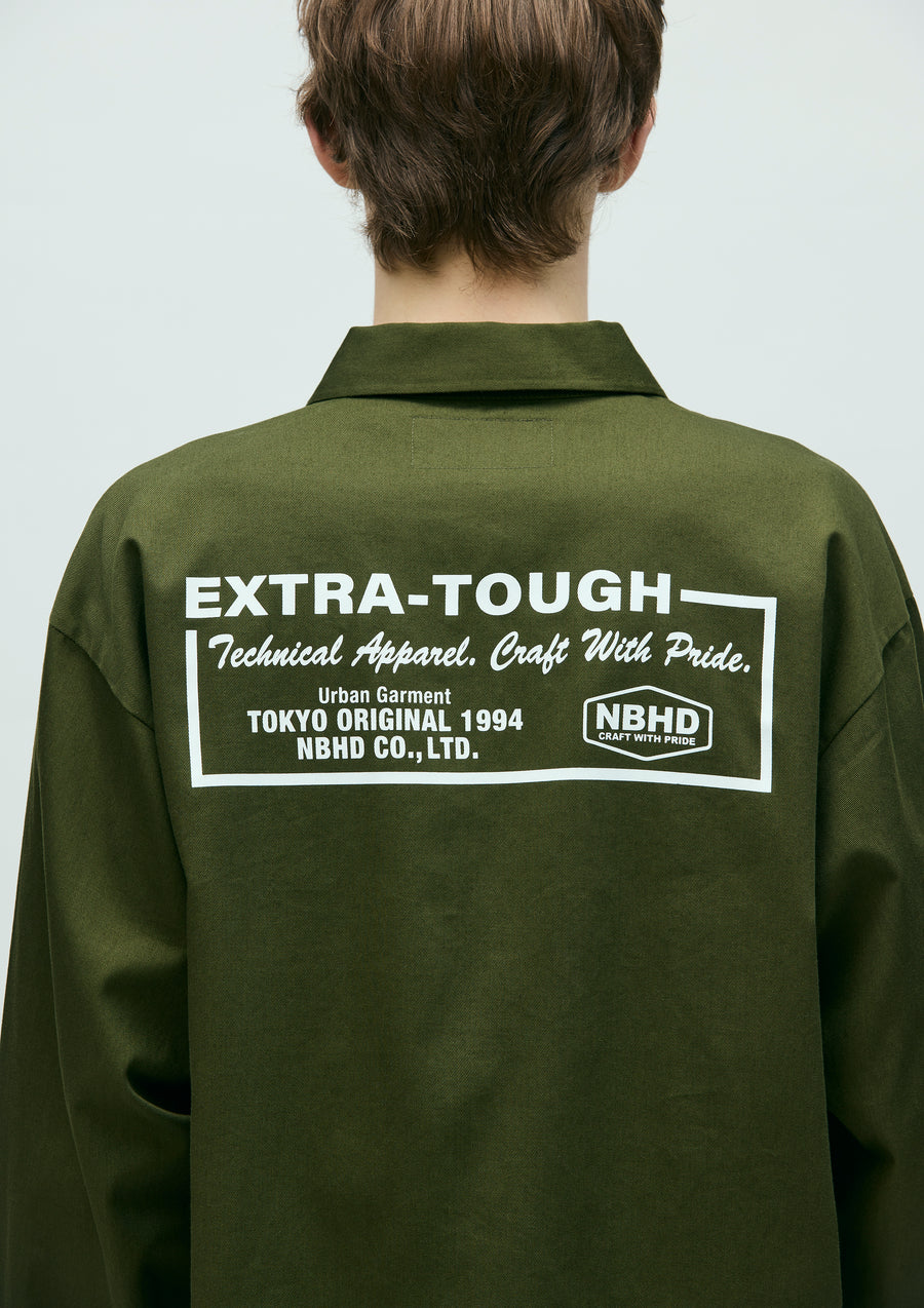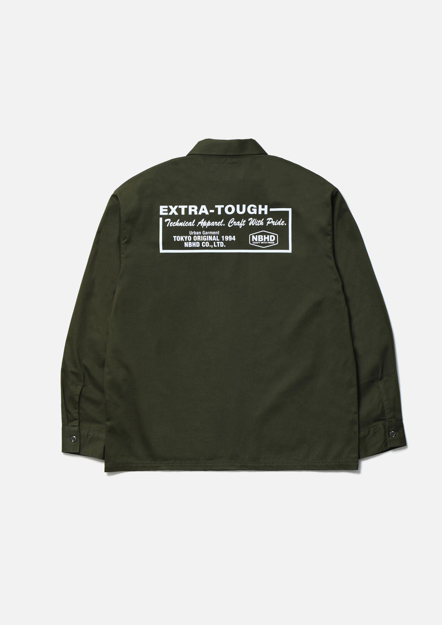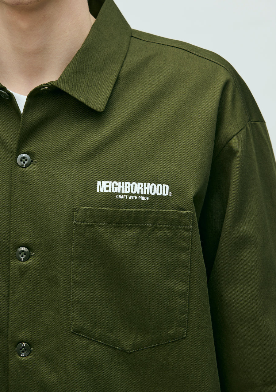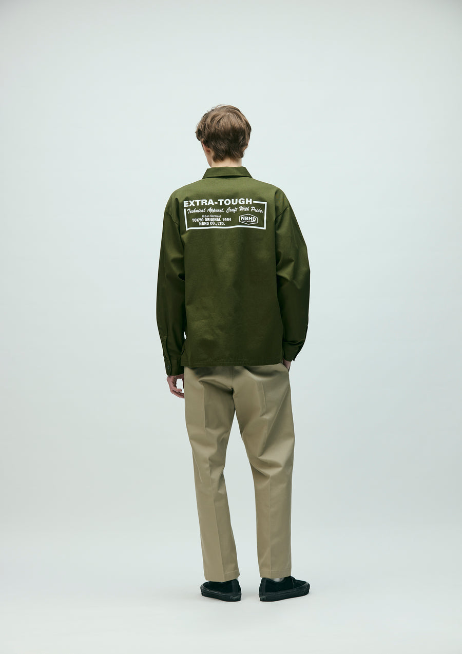 Work shirt crafted from a twill fabric woven with balanced density and weight, giving it a casual yet refined texture. Features patch pockets on both chests, with printed graphics on the left chest and back. Finished with original buttons, a brand tag at the left hem and inside the front placket, and a woven side label at the side seam. Completed with a one-wash finish.