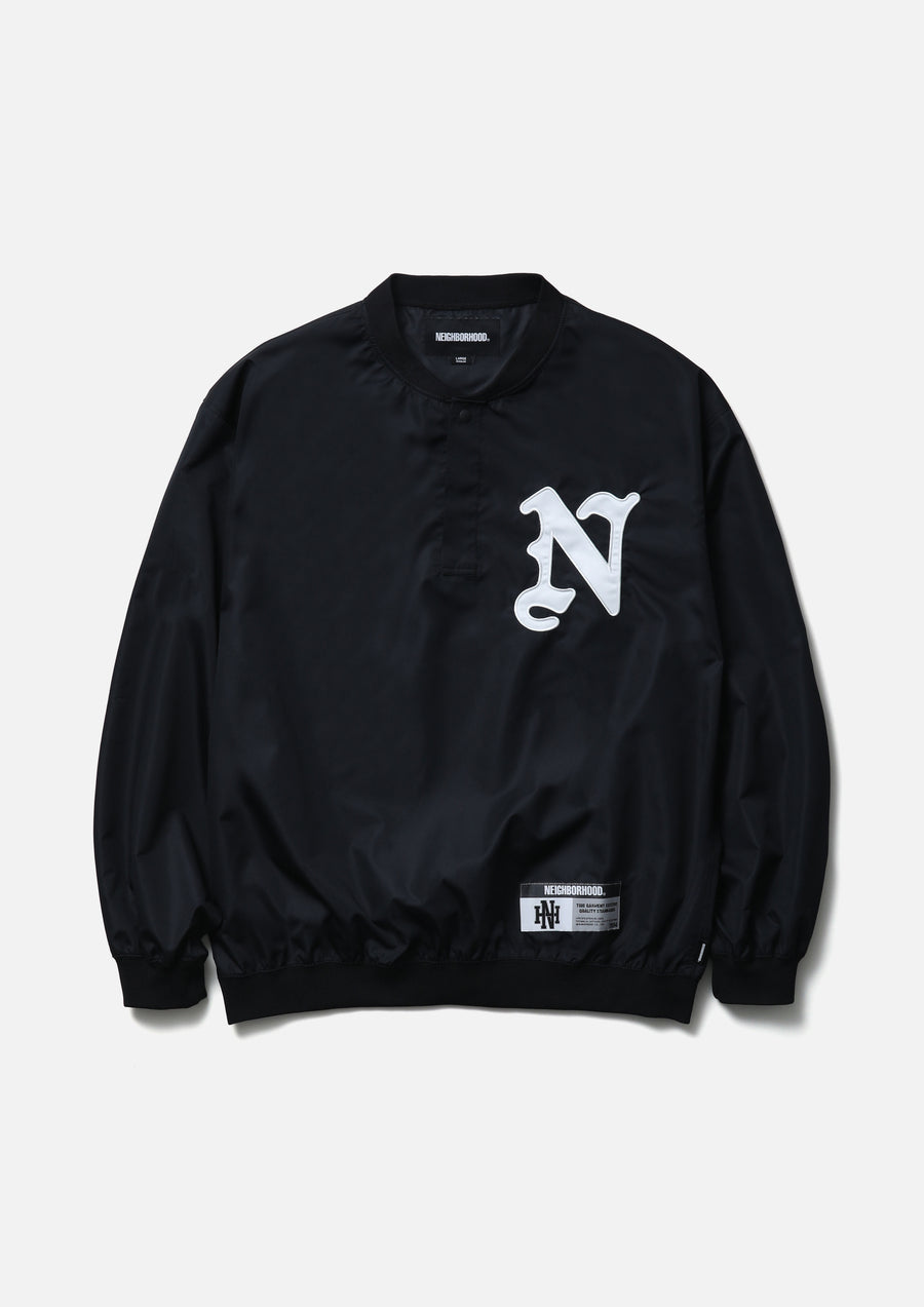 Pullover shirt made from high-performance taffeta fabric with excellent durable water repellency and breathability. Featuring the natural texture of a non-coated finish with a clear, high-density look, it is slightly lightweight with a soft hand feel. Designed with a henley neckline and ribbed collar, hem, and cuffs. Detailed with an embroidered patch on the left chest. A brand tag is placed at the left hem, and a woven side label is attached at the side seam.