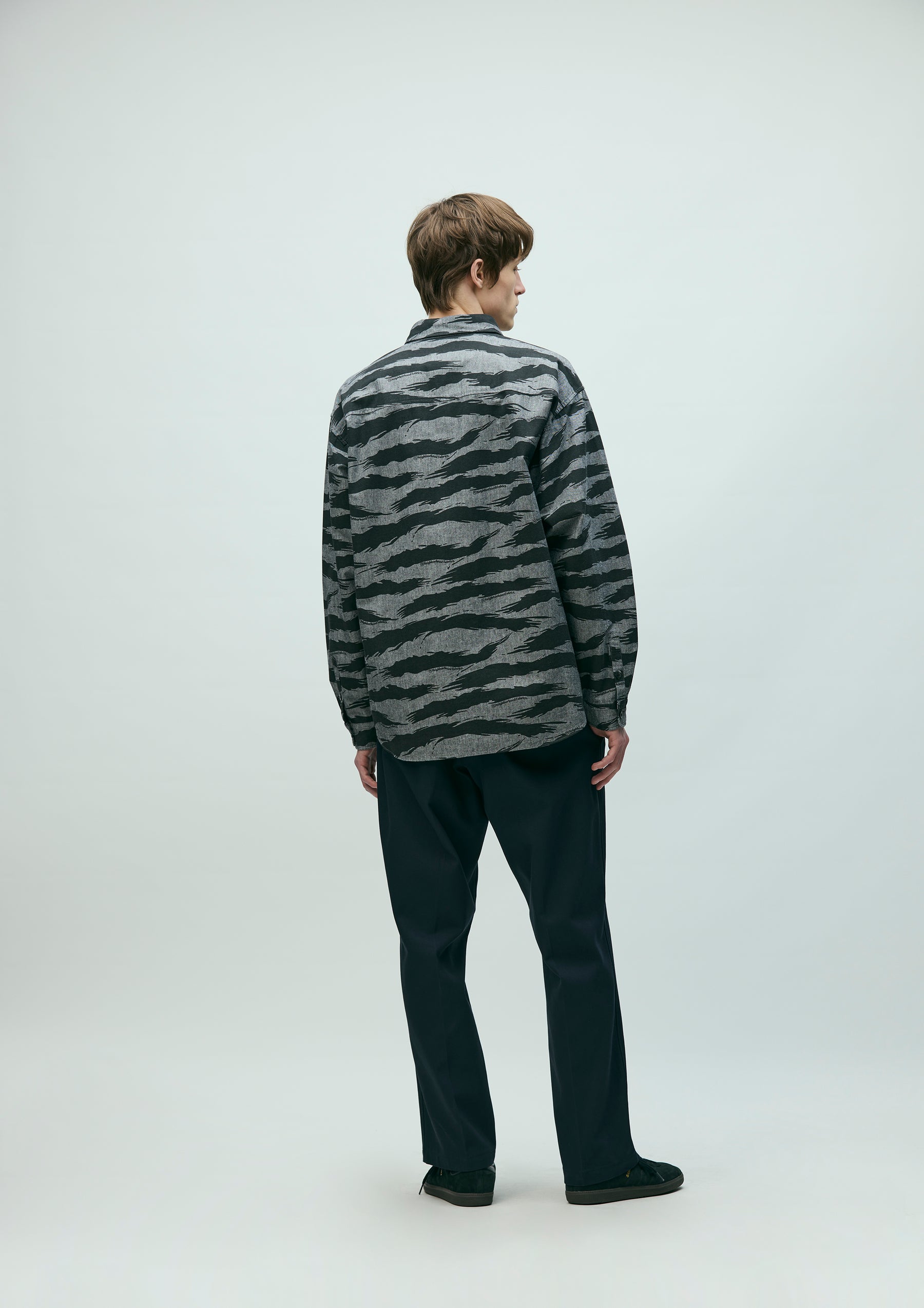 Chambray shirt printed with an original camouflage pattern on chambray fabric. Designed with classic plain-shirt detailing and a patch pocket on the left chest. Finished with original buttons, a brand tag at the left hem and inside the front placket, and a woven side label at the side seam. Completed with a one-wash finish.