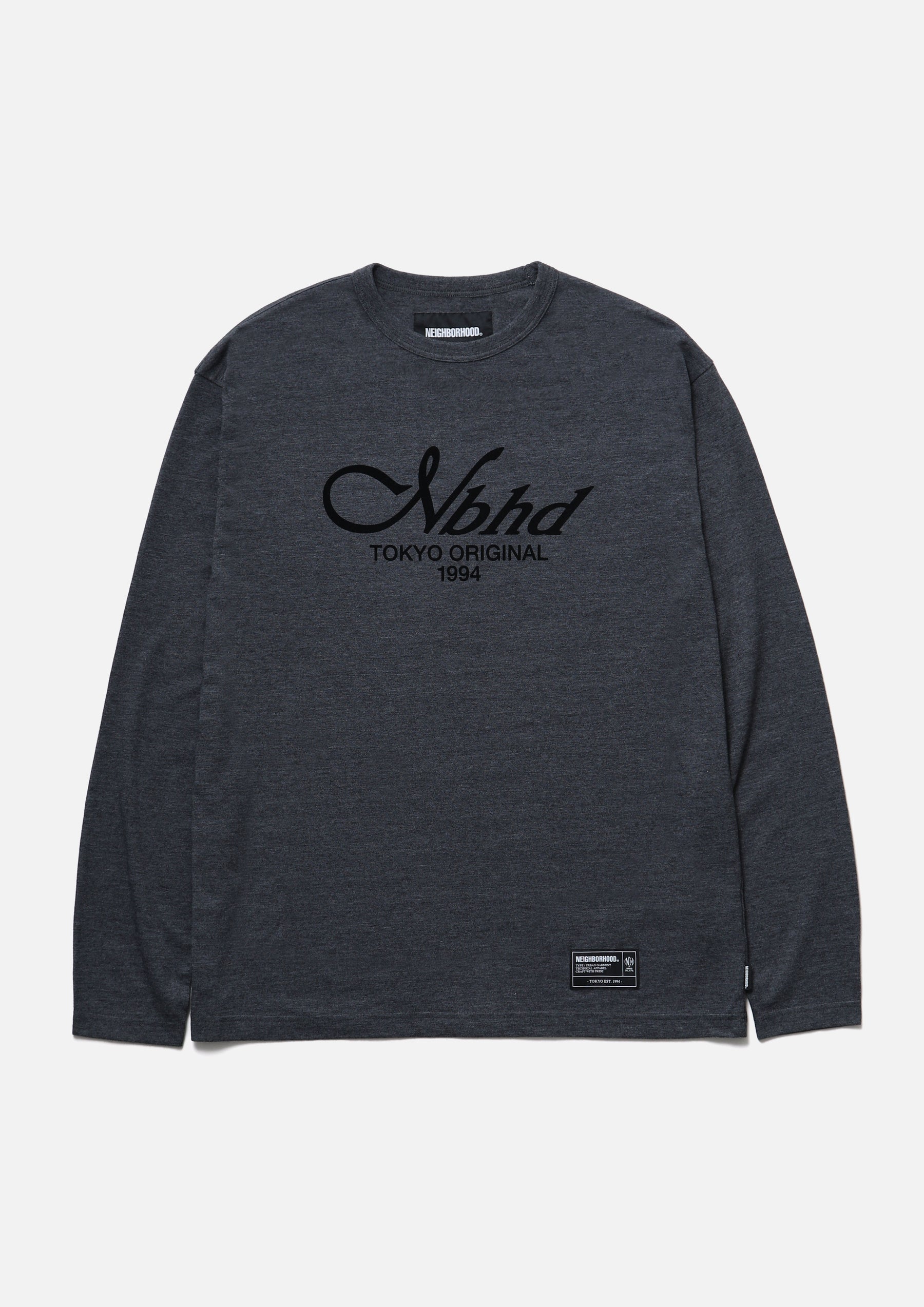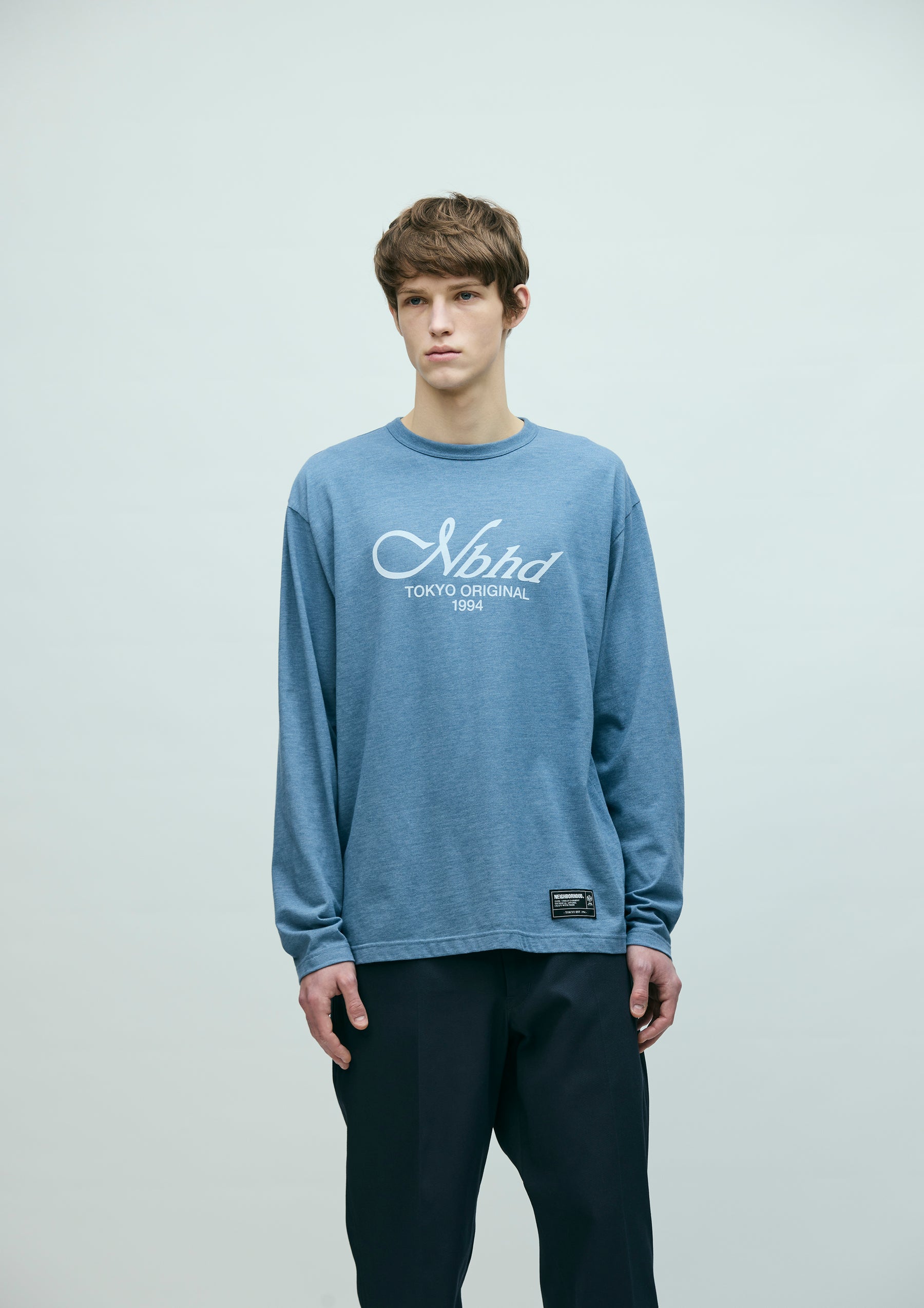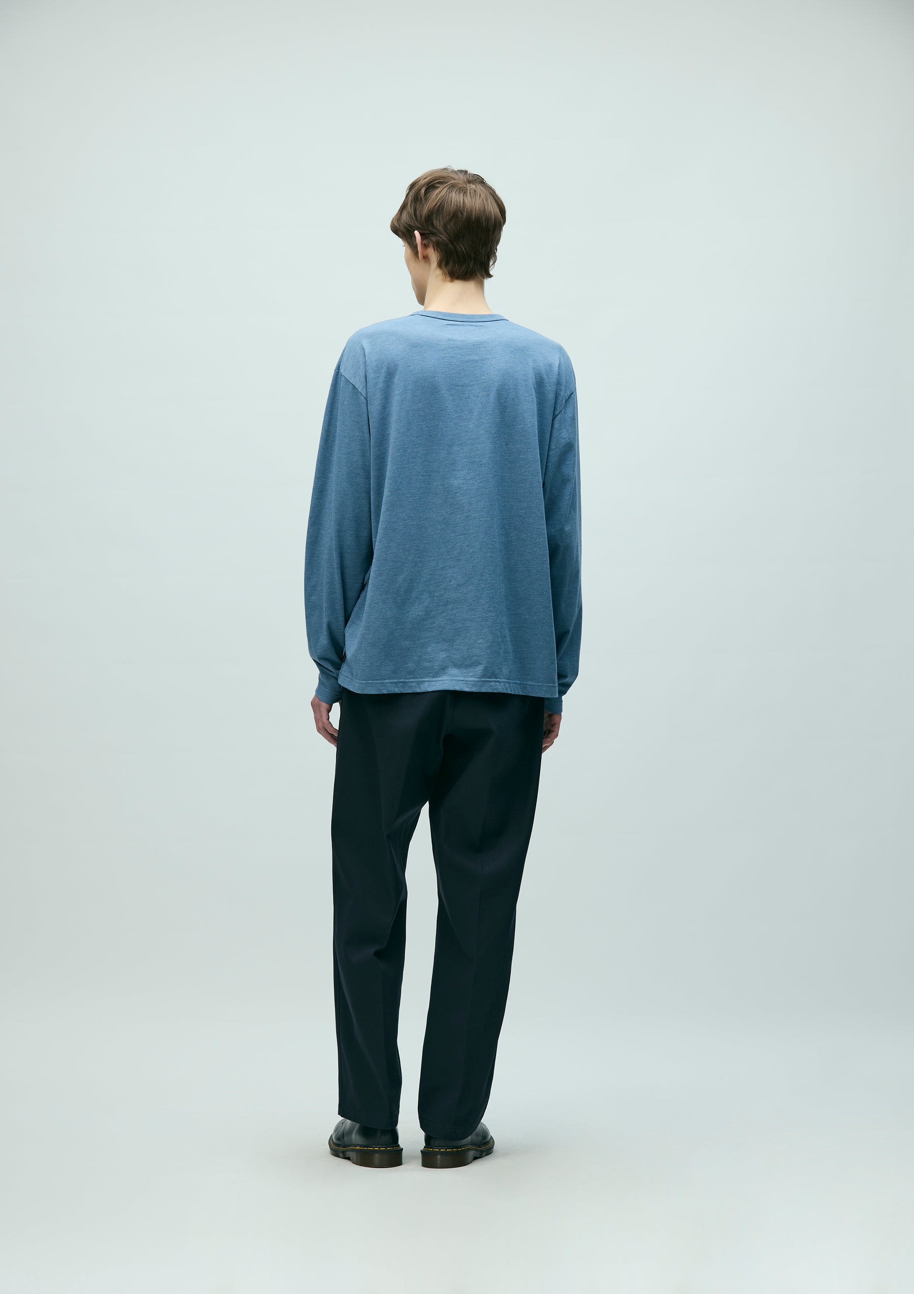 Long-sleeve crewneck cut-and-sew top made from eco jersey fabric. Features a flock-printed logo on the front. A brand tag is placed at the left hem, and a woven side label is attached at the side seam. Completed with a one-wash finish.