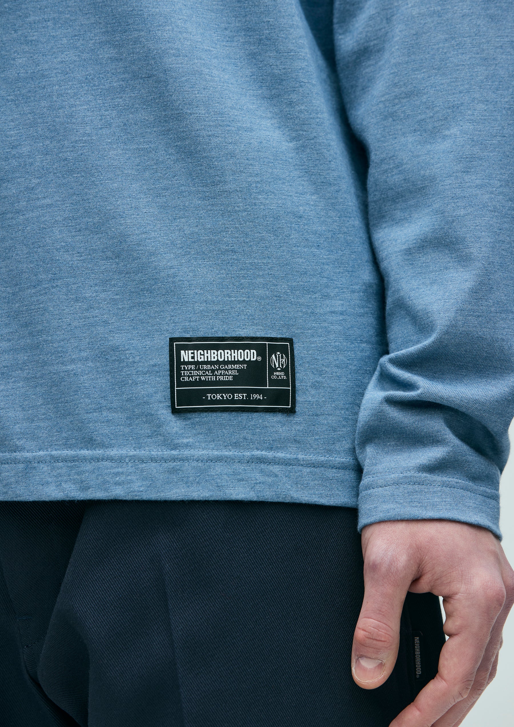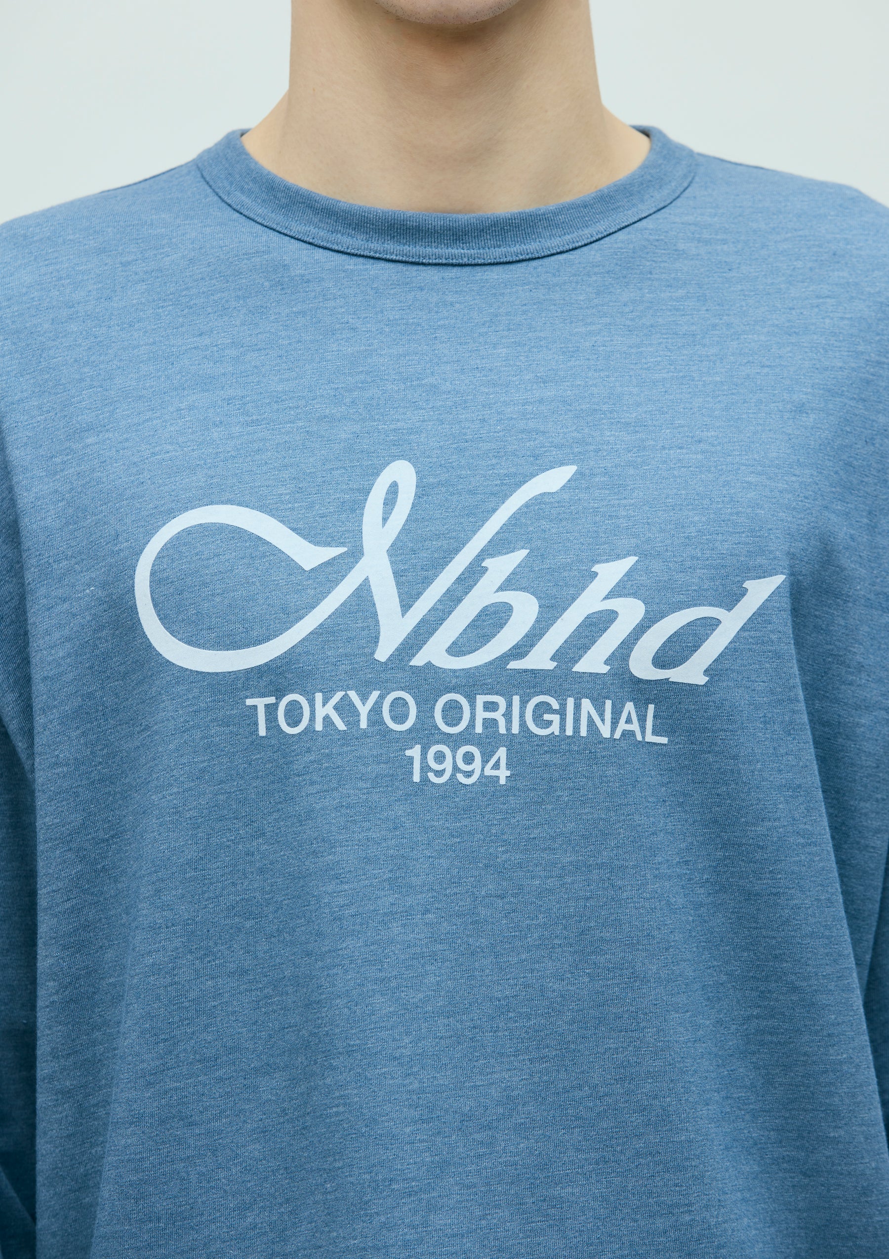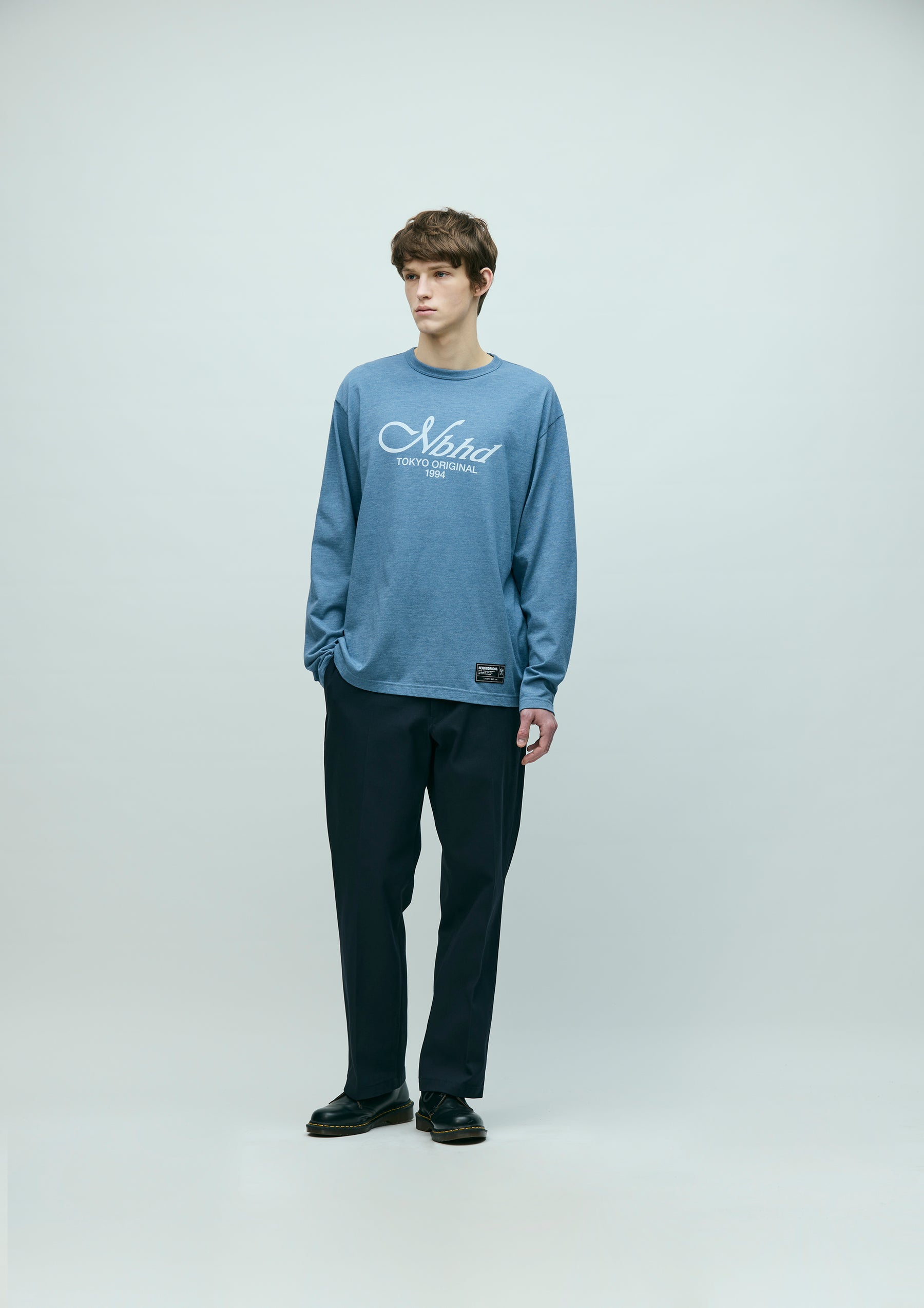 Long-sleeve crewneck cut-and-sew top made from eco jersey fabric. Features a flock-printed logo on the front. A brand tag is placed at the left hem, and a woven side label is attached at the side seam. Completed with a one-wash finish.