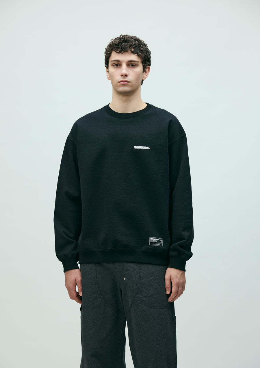 Crewneck pullover made from medium-weight cotton fleece fabric. Features printed logos on the left chest and back. A brand tag is placed at the left hem, and a woven side label is attached at the side seam. Completed with a one-wash finish.