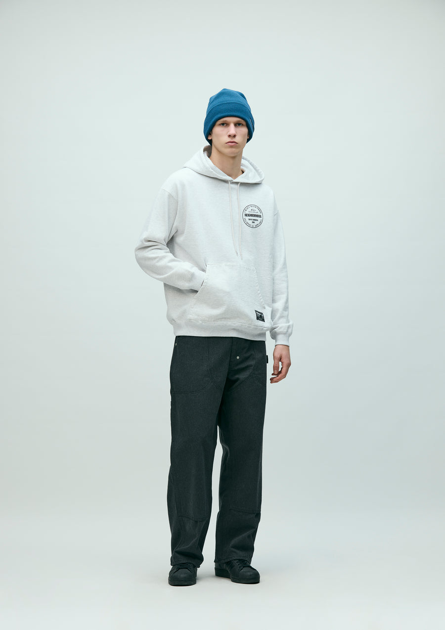 Pullover hoodie made from medium-weight cotton fleece fabric. Features printed logos on the left chest and back, with an original adjustable drawcord at the hood. A brand tag is placed at the left hem, and a woven side label is attached at the side seam. Completed with a one-wash finish.