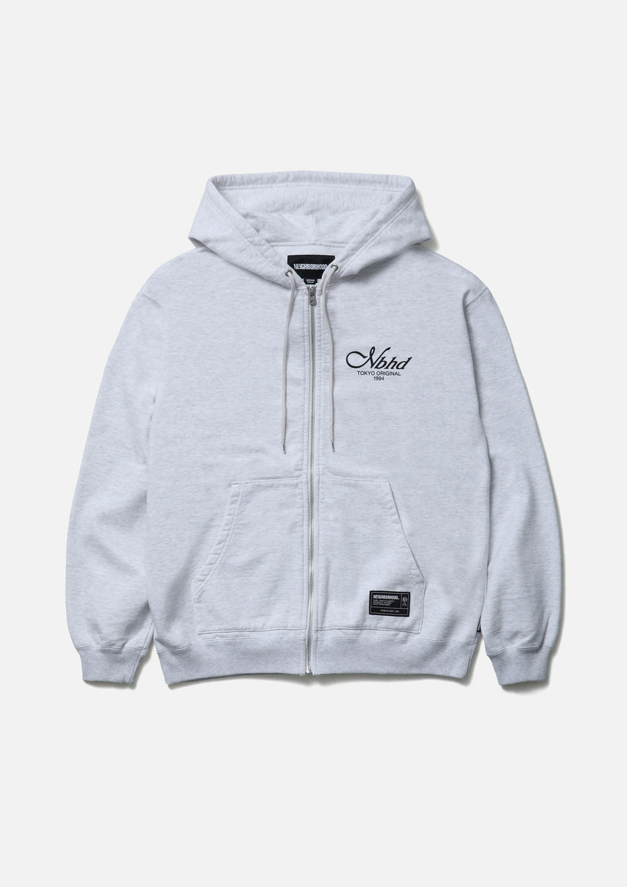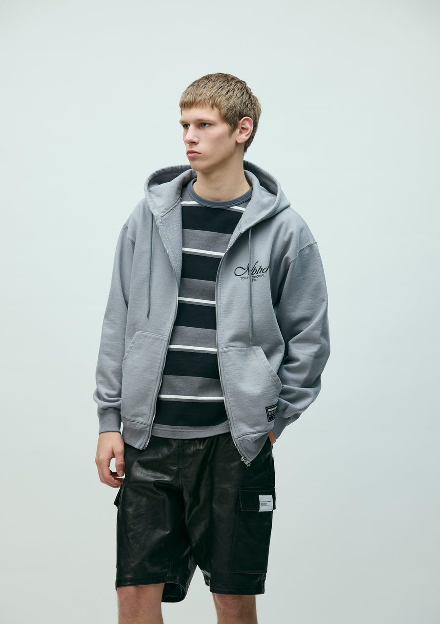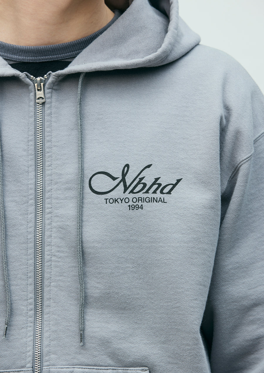 Zip-up hoodie made from medium-weight cotton fleece fabric. Features printed logos on the left chest and back. Equipped with an original adjustable drawcord at the hood and original zipper pulls. A brand tag is placed at the left hem, and a woven side label is attached at the side seam. Completed with a one-wash finish.