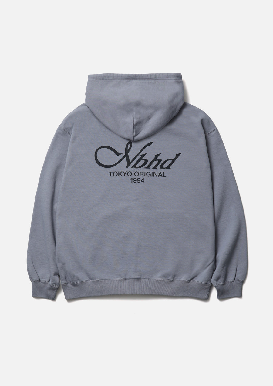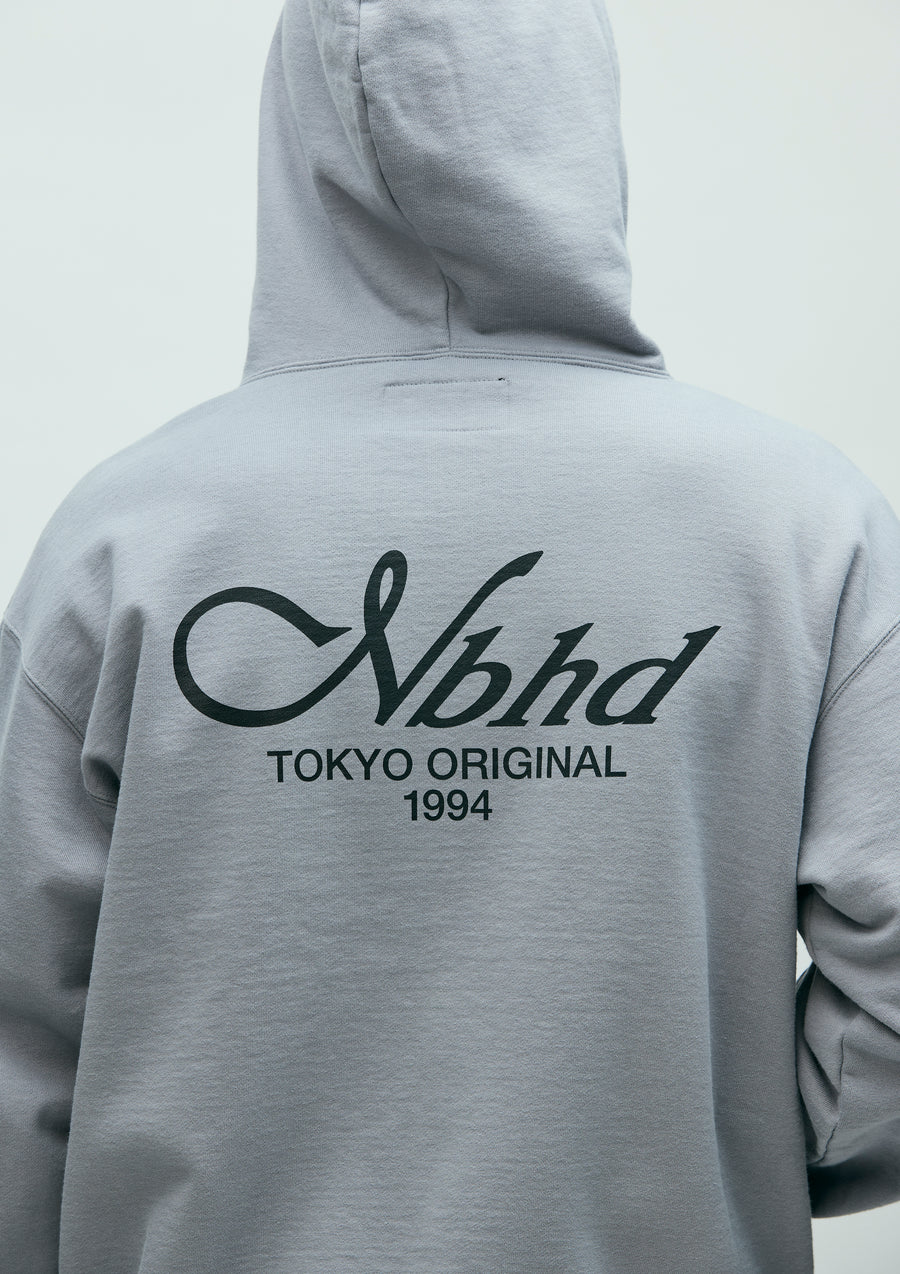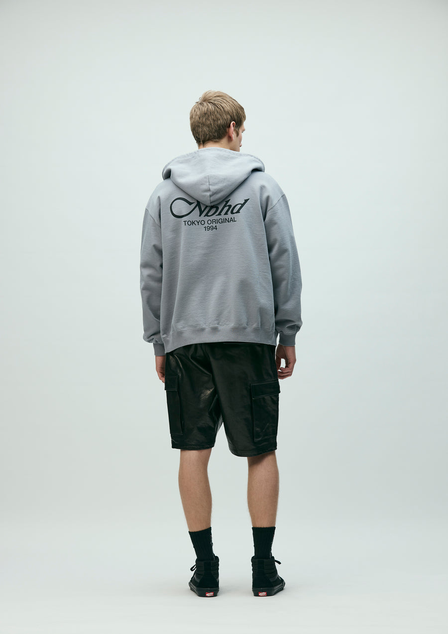 Zip-up hoodie made from medium-weight cotton fleece fabric. Features printed logos on the left chest and back. Equipped with an original adjustable drawcord at the hood and original zipper pulls. A brand tag is placed at the left hem, and a woven side label is attached at the side seam. Completed with a one-wash finish.
