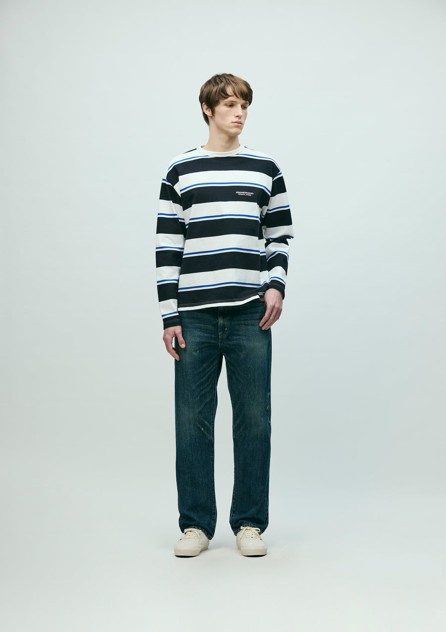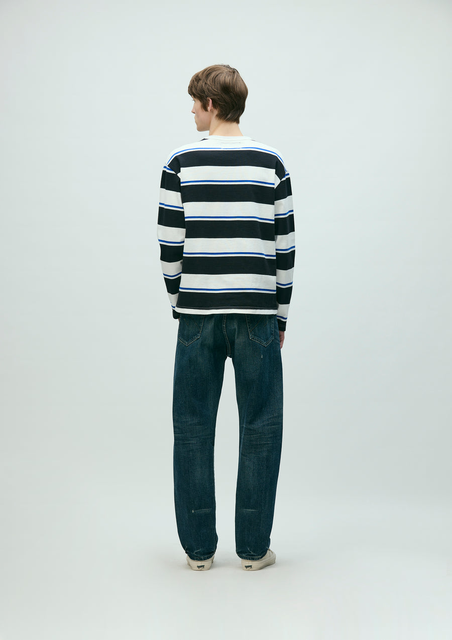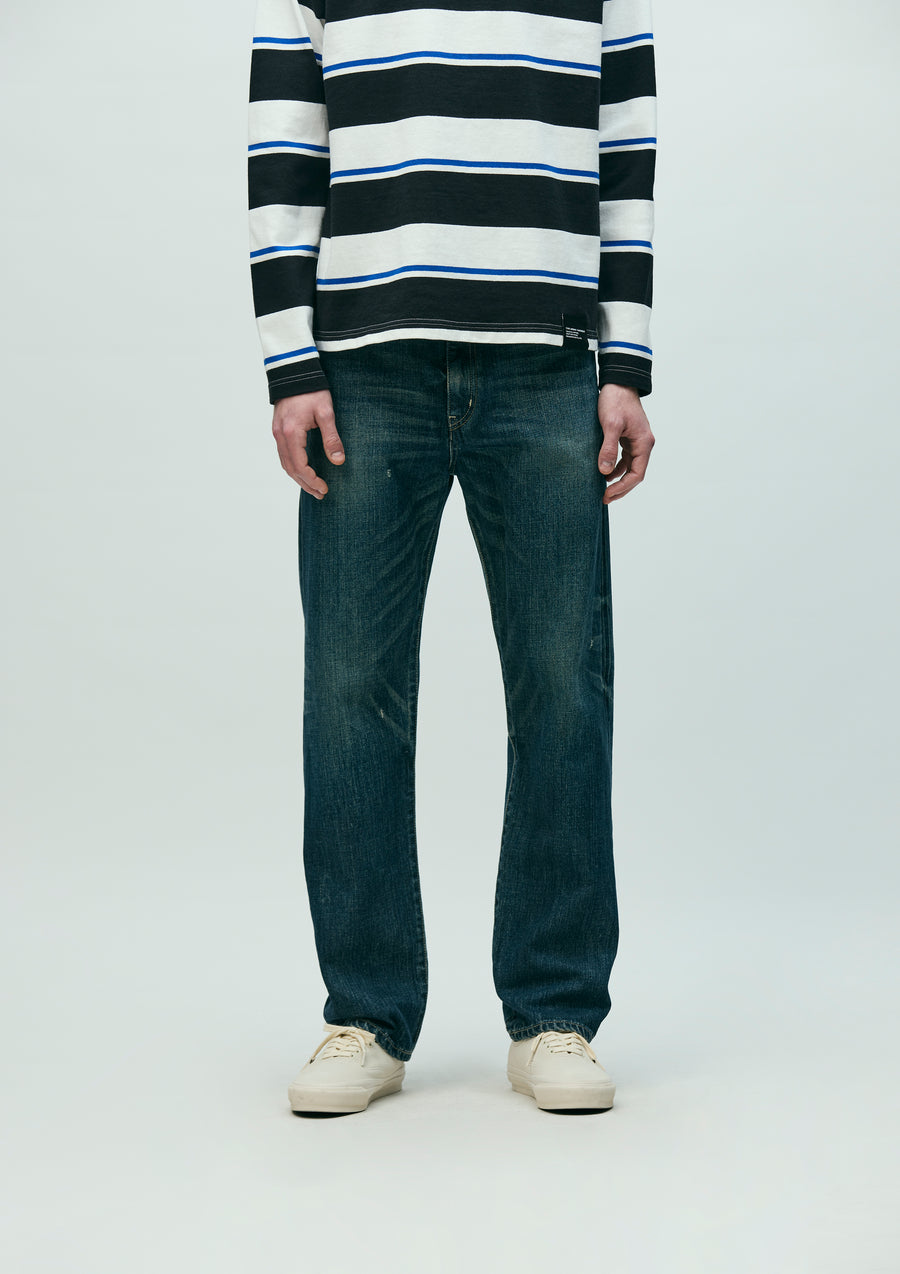 12 oz. original denim pants with a washed finish. All parts, from the selvedge denim fabric to the buttons and rivets, are all original. Details such as signature tape on the front zipper fly, "N" stitching on the hip pockets, and leather patches. Exclusive size label is attached to custom crafted item. Slim tapered silhouette with room around the waist.