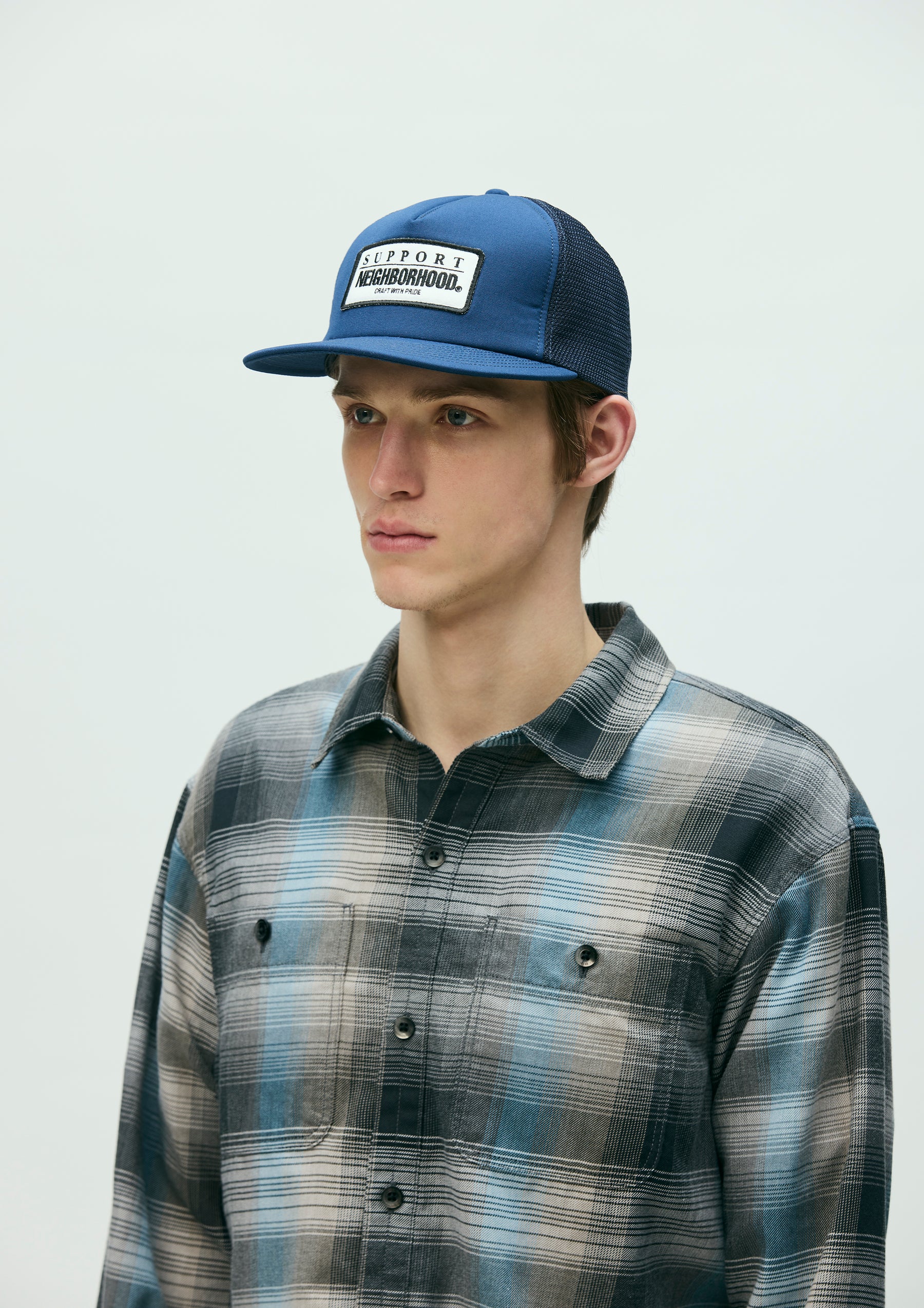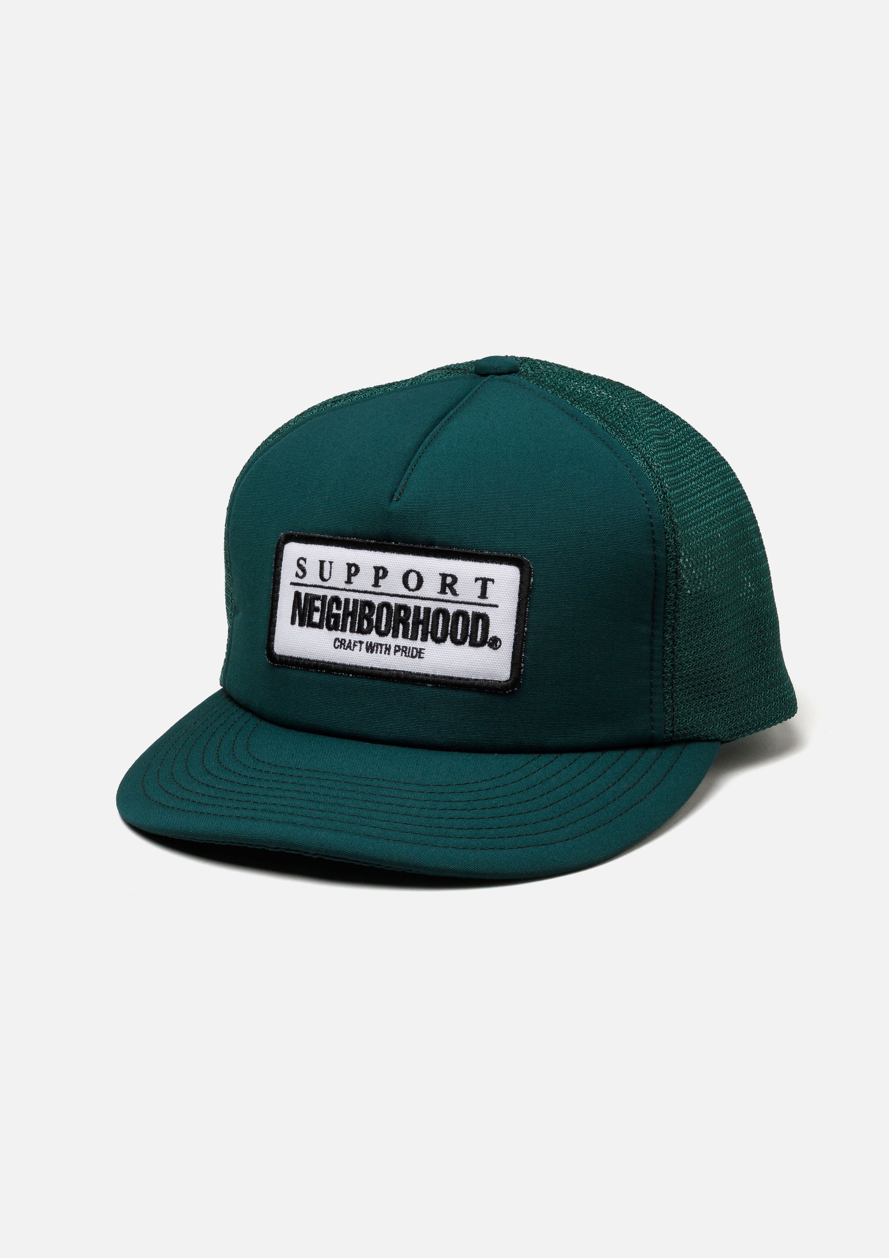 A mesh cap made from polyester-rayon cloth and nylon mesh. Features an embroidered patch on the front and a snapback adjuster at the rear.