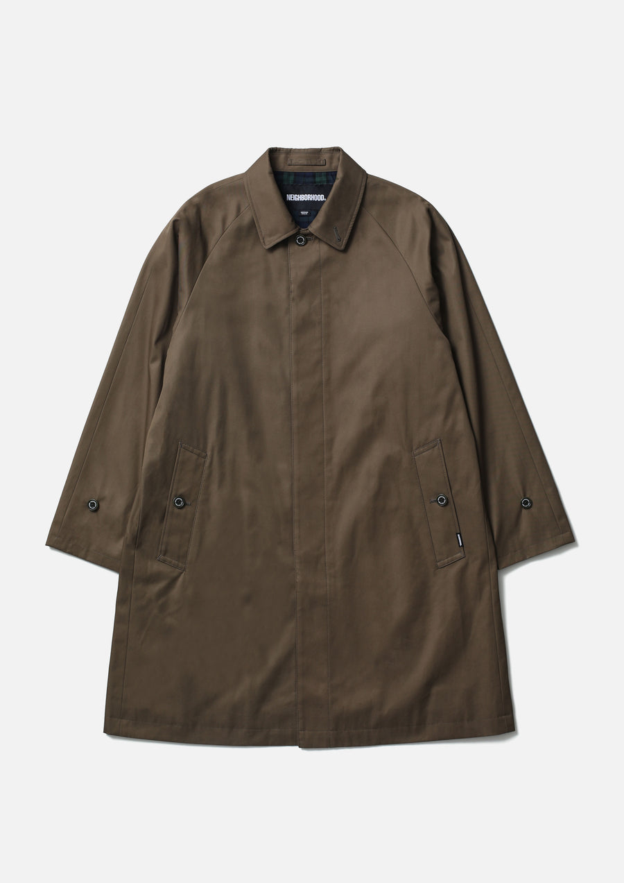 Bal-collar coat made from Ventile® gabardine fabric, offering both water repellency and breathability. The high-density cotton weave blocks external moisture while allowing internal vapor to escape. Designed with classic details such as raglan sleeves, box pockets, adjustable sleeve tabs, and a concealed front placket. Finished with original buttons. A brand tag is placed at the right front hem, and a woven side label is attached beside the pocket.