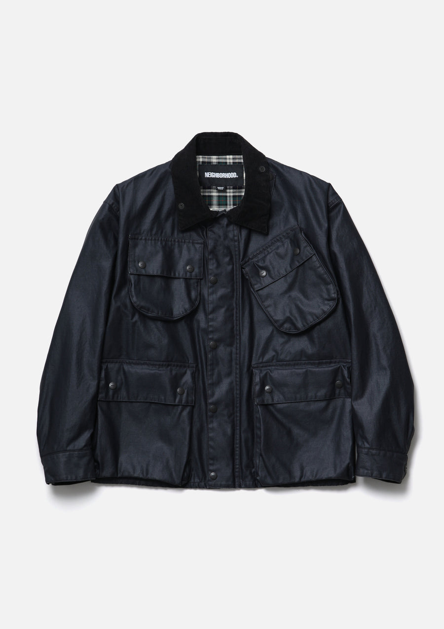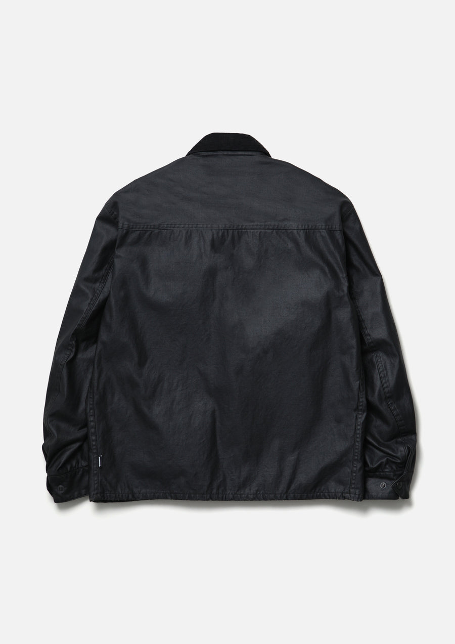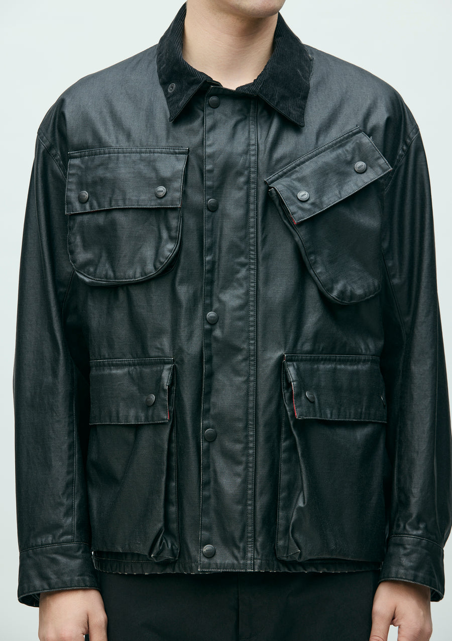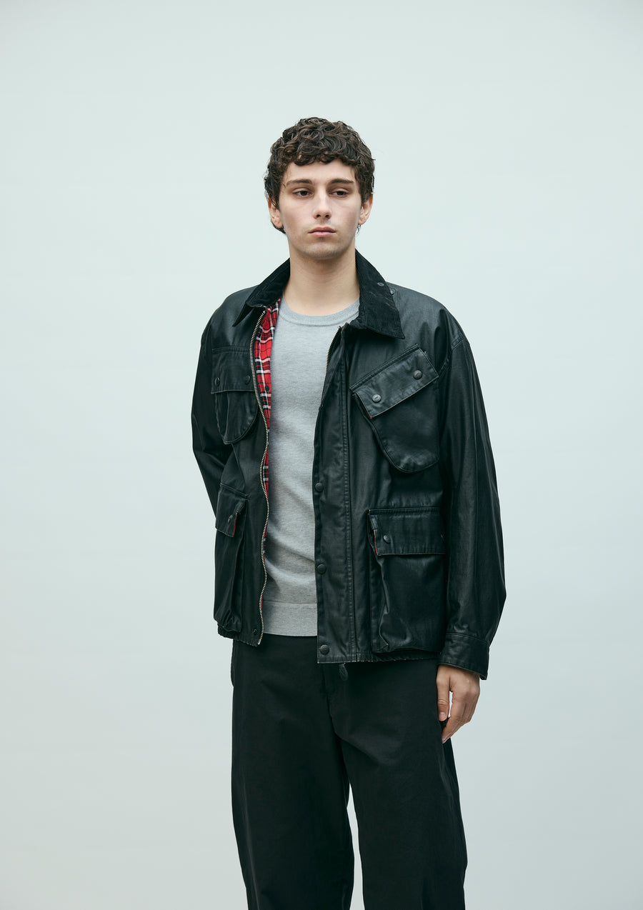 Coated Field Jacket made from back satin fabric with a pigment coating that gives it a leather-like appearance. Over time, washing and wear bring out scuffs and fades, creating a rich, evolving character. Features a corduroy contrast collar and tartan check lining. Designed with large gusseted front pockets, a wind-guard collar tab, and a dual front closure with both snap placket and zipper. Finished with original snap buttons and zipper pulls. A woven side label is attached at the side seam.