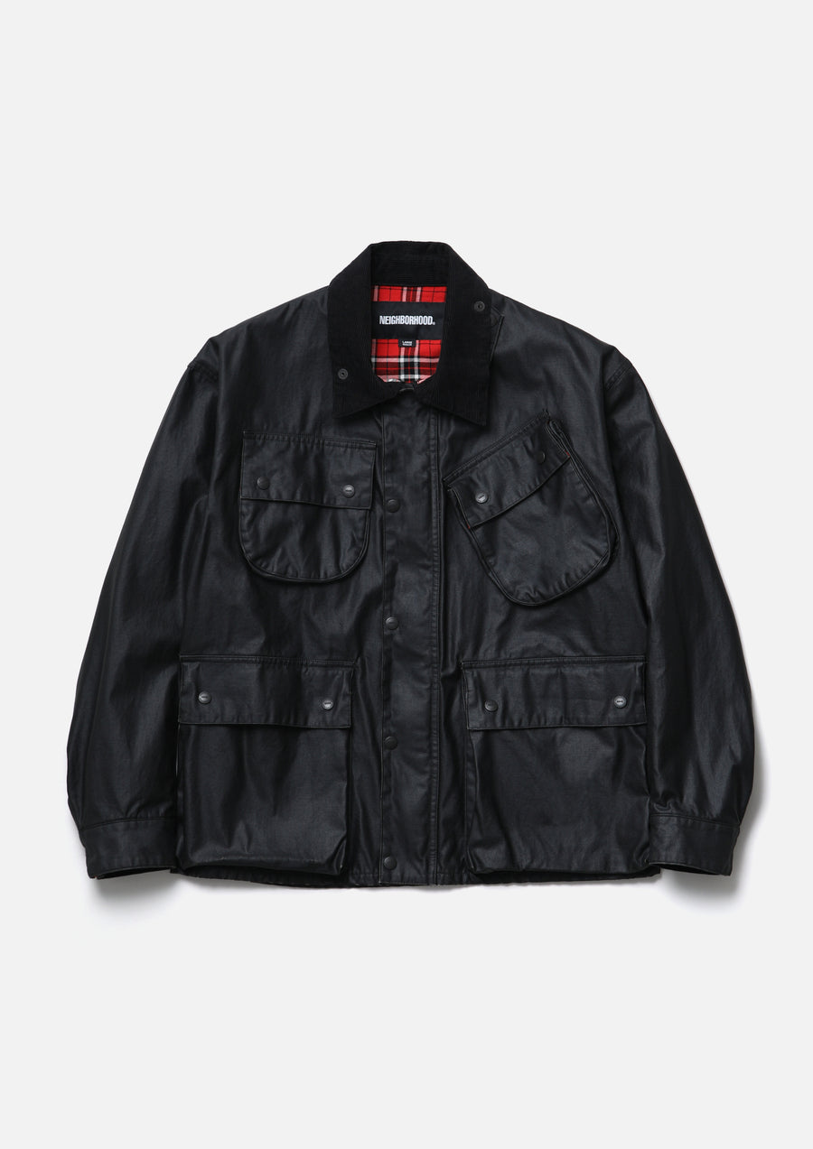 Coated Field Jacket made from back satin fabric with a pigment coating that gives it a leather-like appearance. Over time, washing and wear bring out scuffs and fades, creating a rich, evolving character. Features a corduroy contrast collar and tartan check lining. Designed with large gusseted front pockets, a wind-guard collar tab, and a dual front closure with both snap placket and zipper. Finished with original snap buttons and zipper pulls. A woven side label is attached at the side seam.