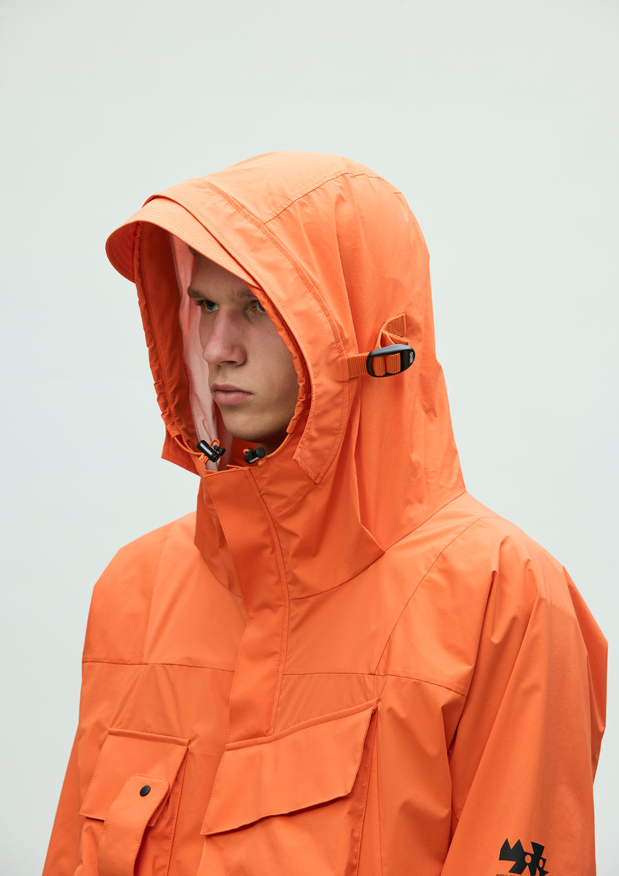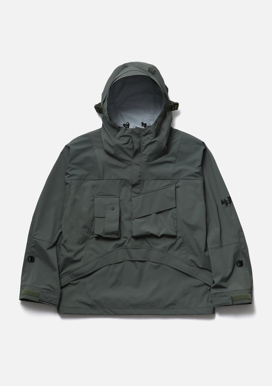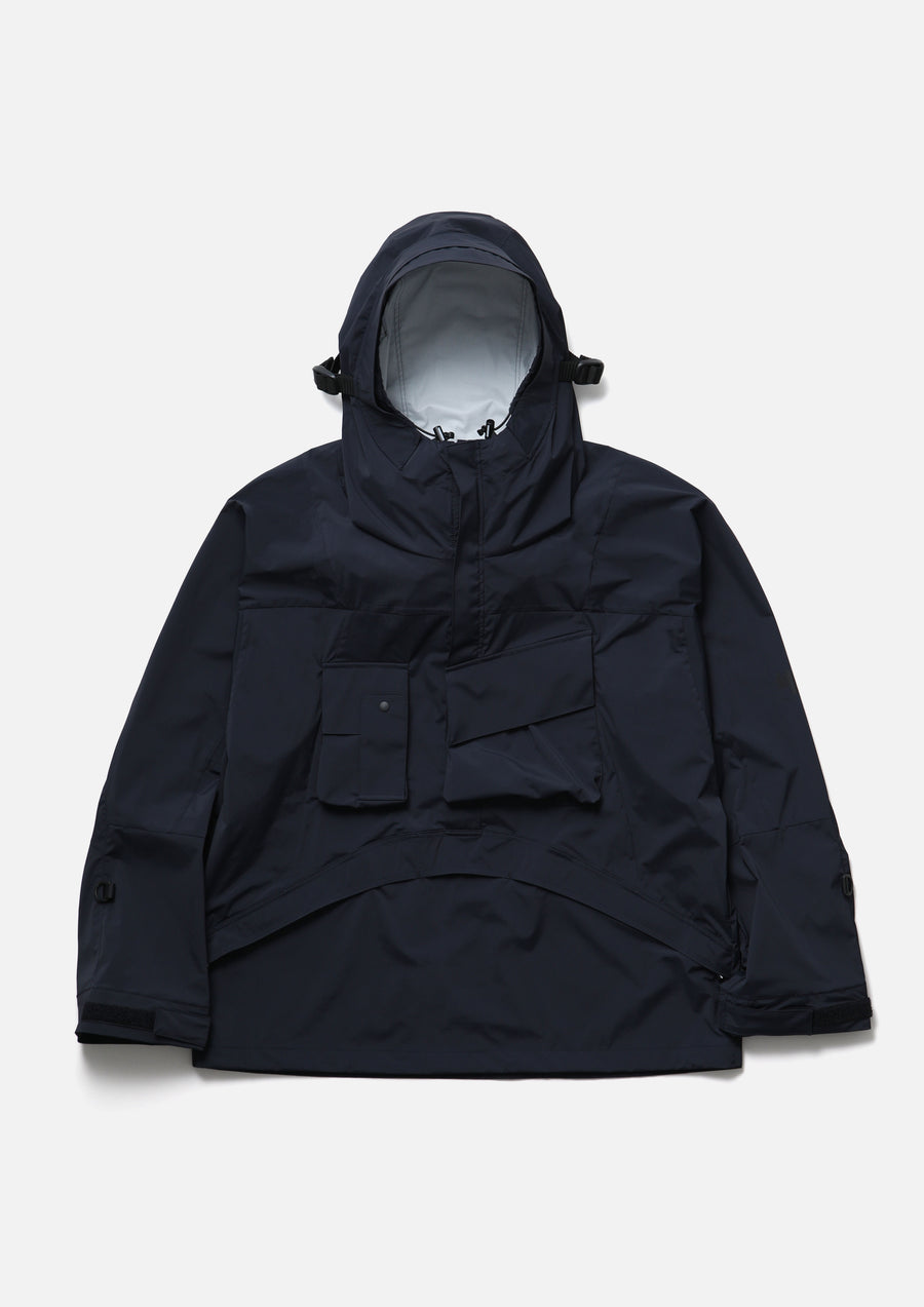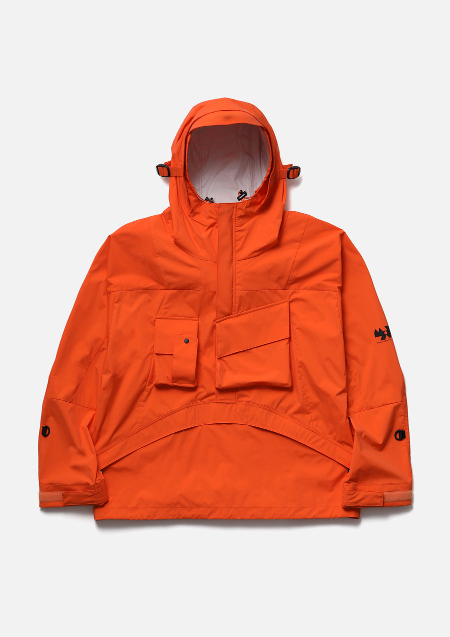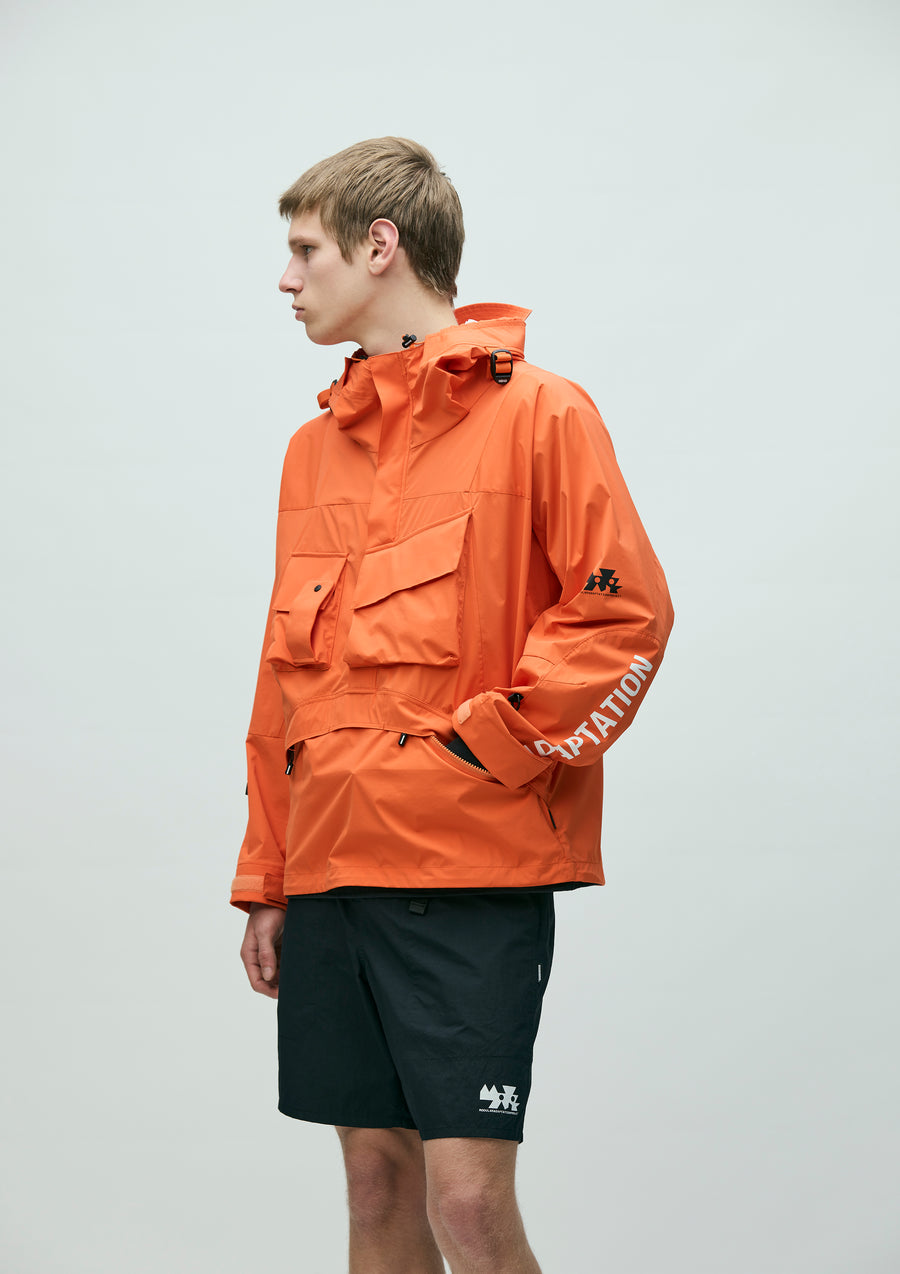 Pullover jacket made from lightweight nylon and PU material with a Calbak 2.5-layer construction, offering excellent waterproofing and breathability. Designed to reduce internal moisture buildup while providing stretch for comfortable wear. Features a distinctive panel-switching pattern with printed graphics on the hood and sleeves. Equipped with a zip kangaroo pocket, hood buckle, elastic drawcord built into the hem, sleeve adjust tabs, and a D-ring detail. Finished with an original buckle and a woven side label at the side seam.