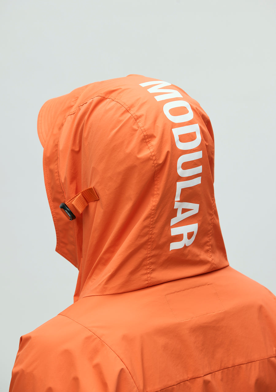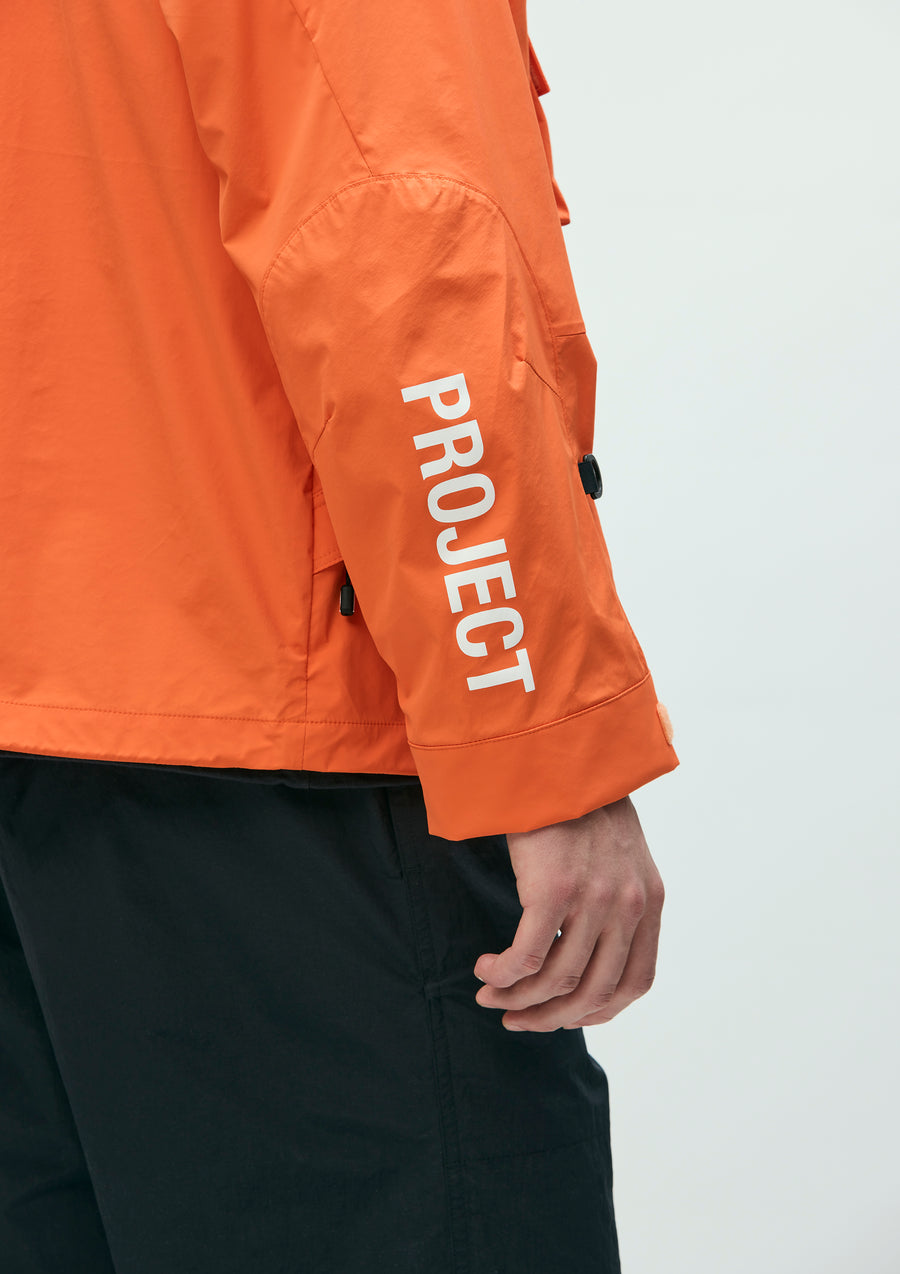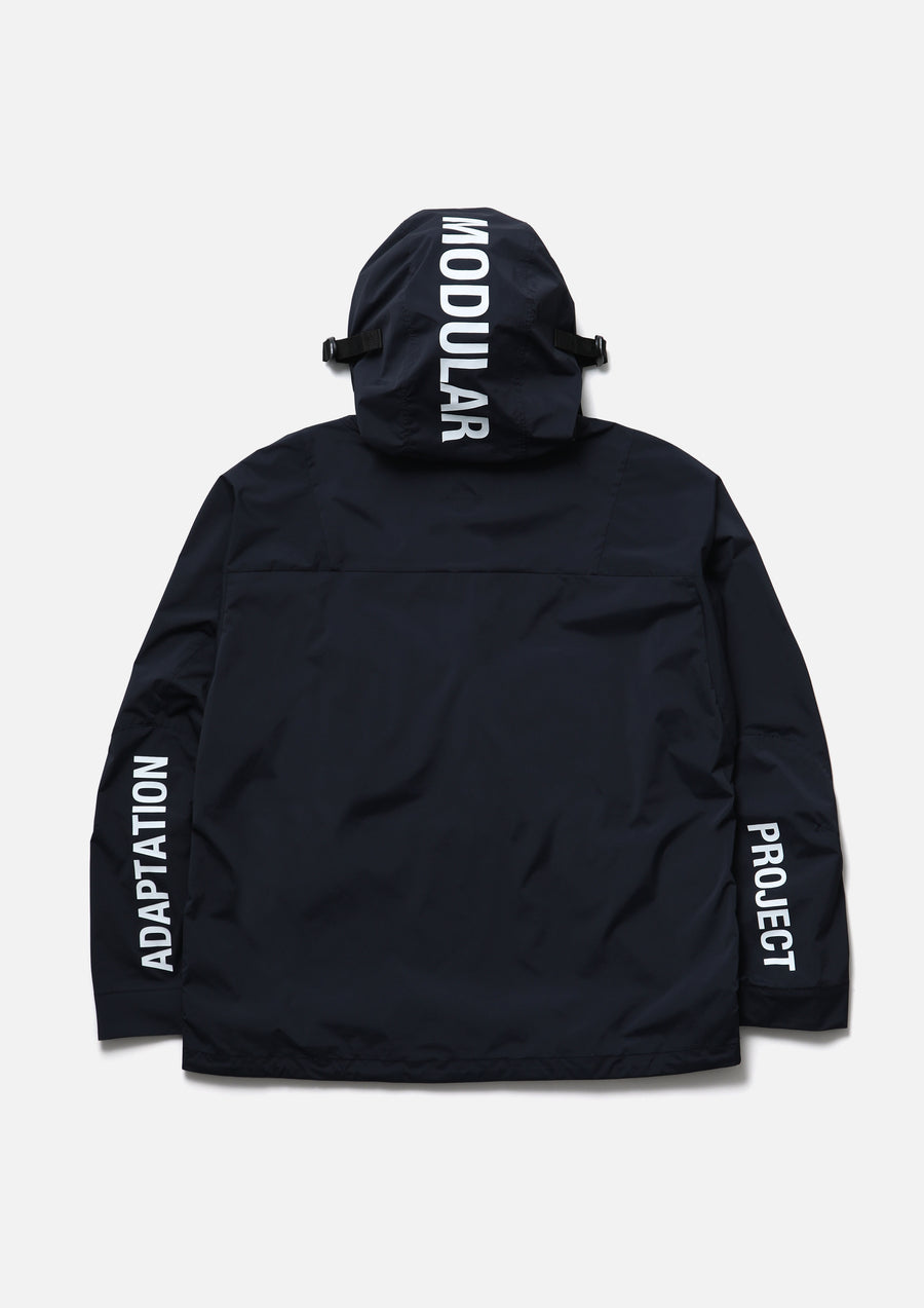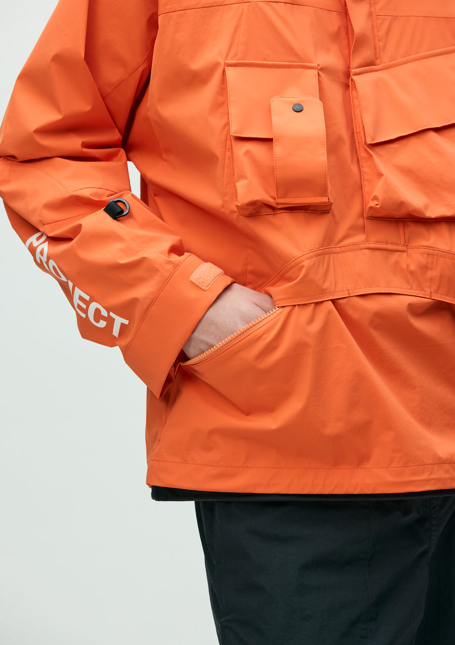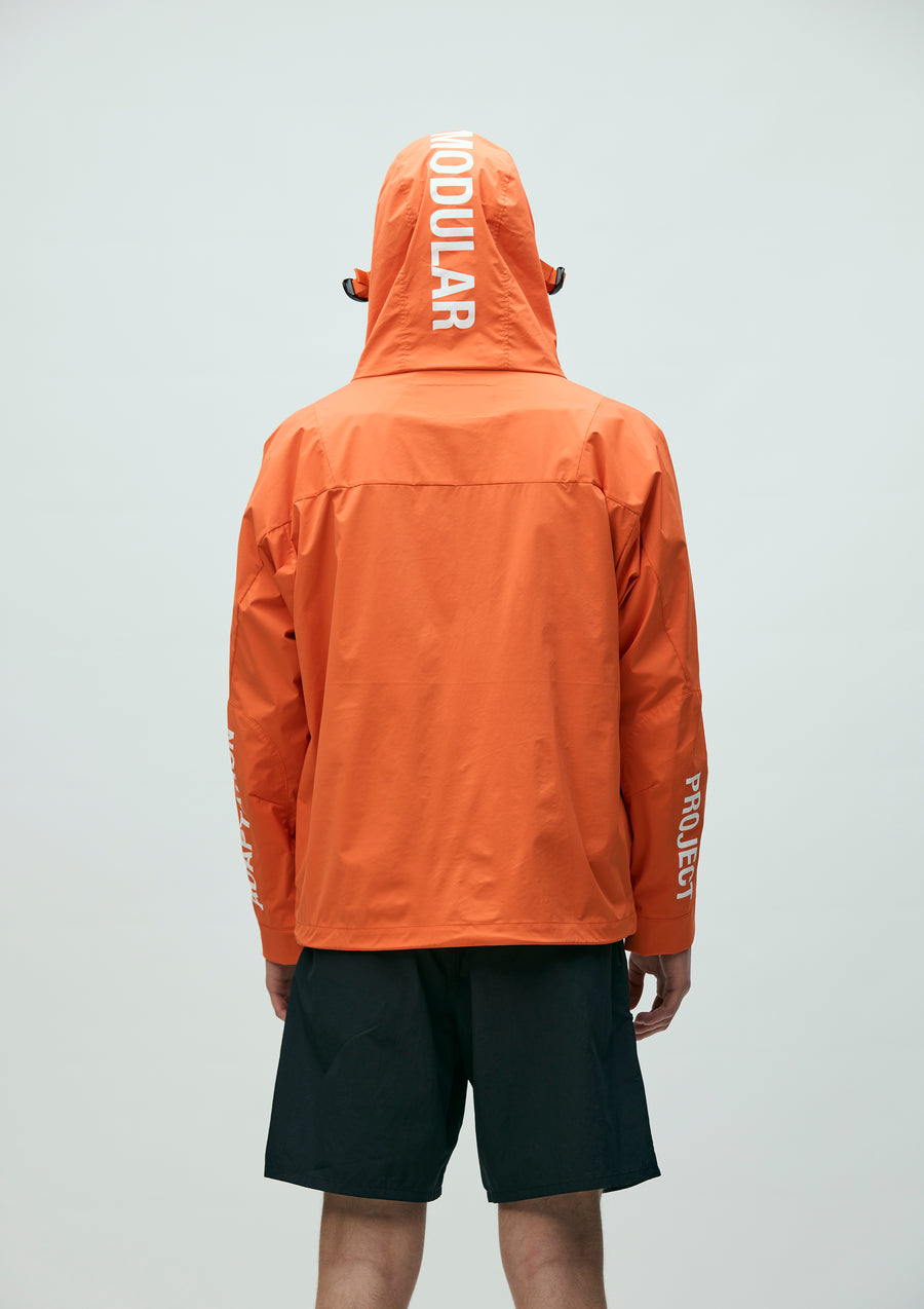 Pullover jacket made from lightweight nylon and PU material with a Calbak 2.5-layer construction, offering excellent waterproofing and breathability. Designed to reduce internal moisture buildup while providing stretch for comfortable wear. Features a distinctive panel-switching pattern with printed graphics on the hood and sleeves. Equipped with a zip kangaroo pocket, hood buckle, elastic drawcord built into the hem, sleeve adjust tabs, and a D-ring detail. Finished with an original buckle and a woven side label at the side seam.