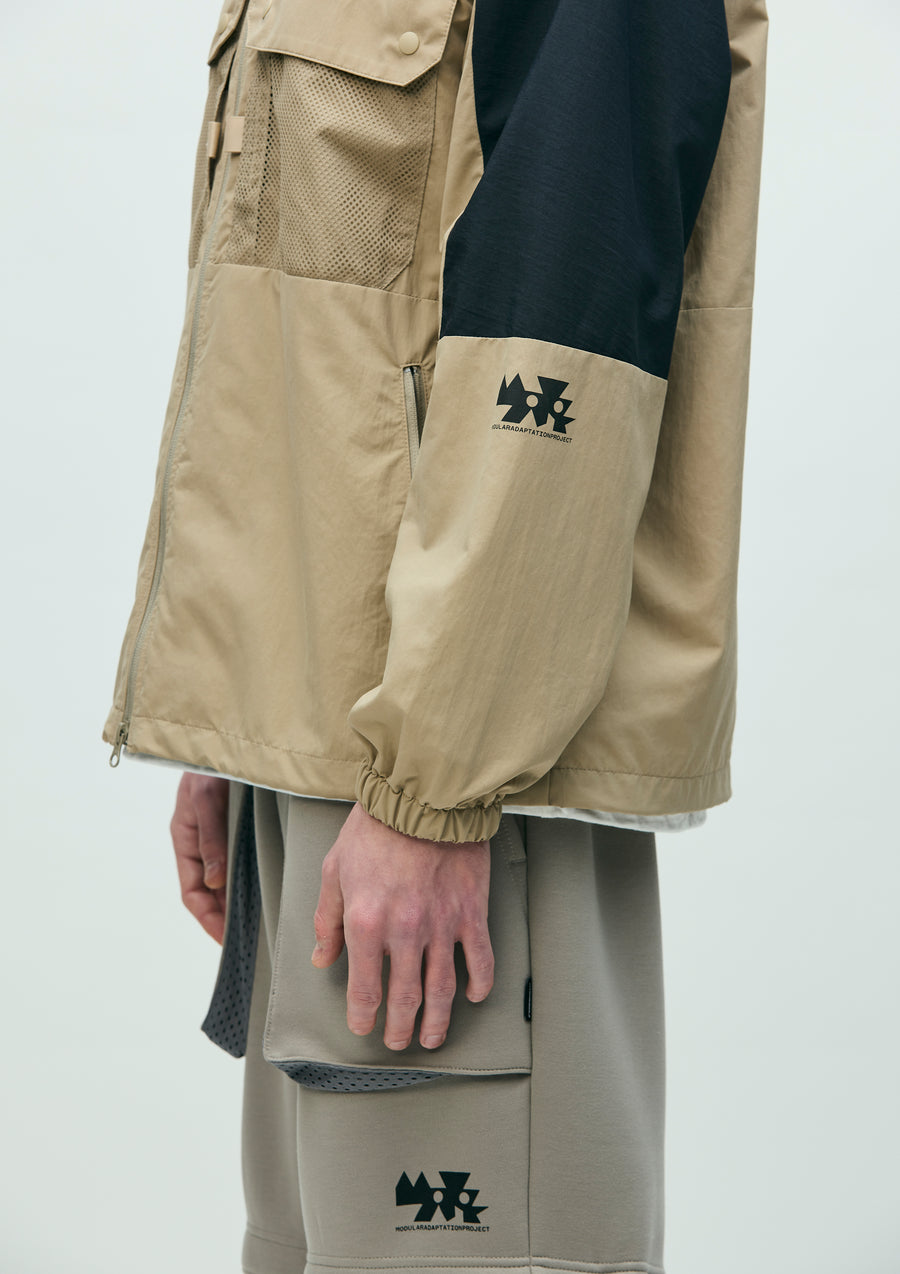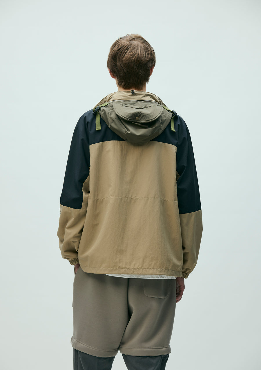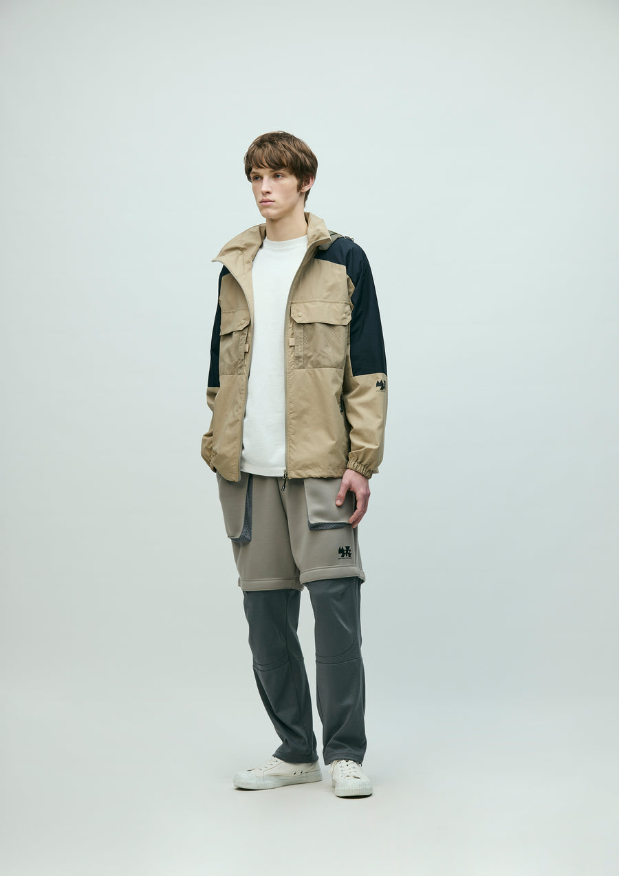 Hooded jacket made from Taslan nylon weather cloth, offering durability, water repellency, and lightweight comfort. The detachable hood is made from lightweight nylon × PU material with a Calbak 2.5-layer construction, providing excellent waterproofing and breathability. Designed with a distinctive panel-switching pattern and printed graphics on the hood and sleeves. Features a dual-use 2-way mesh chest pocket accessible from both vertical and horizontal openings, along with an additional zip pocket. Equipped with an elastic drawcord at the hem, original buckle, and a woven side label at the side seam.