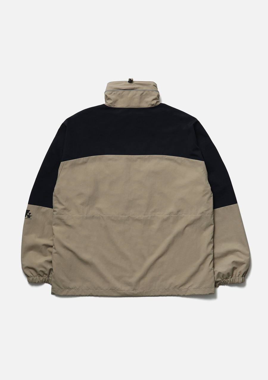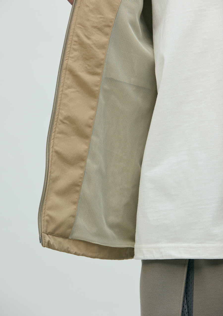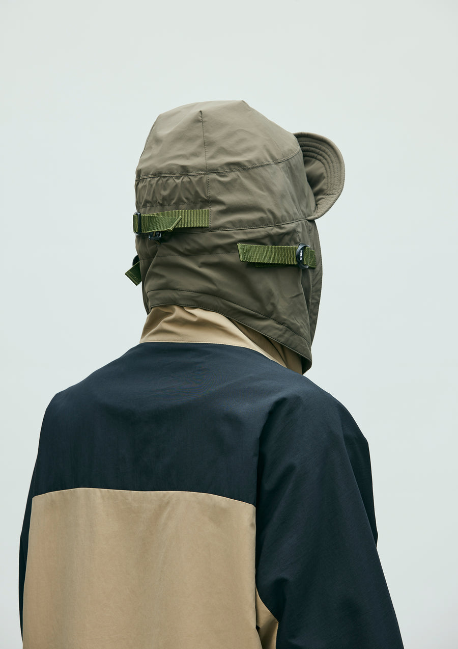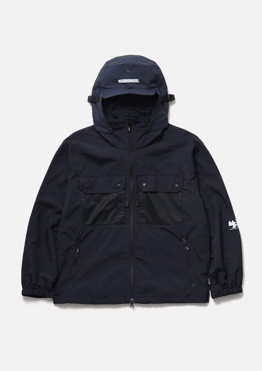 Hooded jacket made from Taslan nylon weather cloth, offering durability, water repellency, and lightweight comfort. The detachable hood is made from lightweight nylon × PU material with a Calbak 2.5-layer construction, providing excellent waterproofing and breathability. Designed with a distinctive panel-switching pattern and printed graphics on the hood and sleeves. Features a dual-use 2-way mesh chest pocket accessible from both vertical and horizontal openings, along with an additional zip pocket. Equipped with an elastic drawcord at the hem, original buckle, and a woven side label at the side seam.