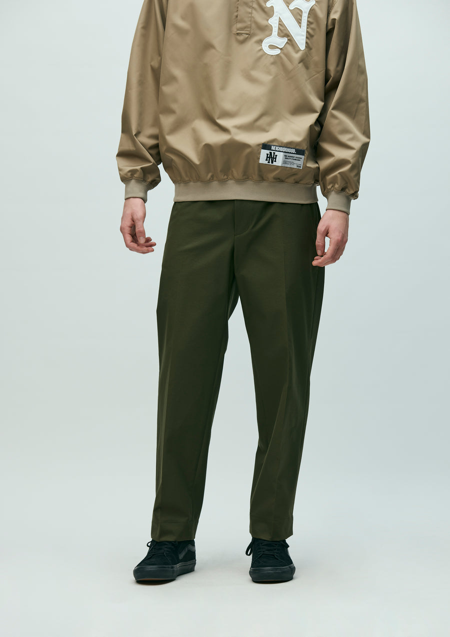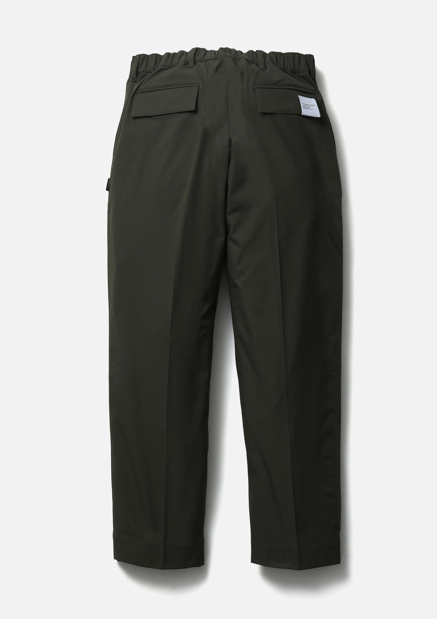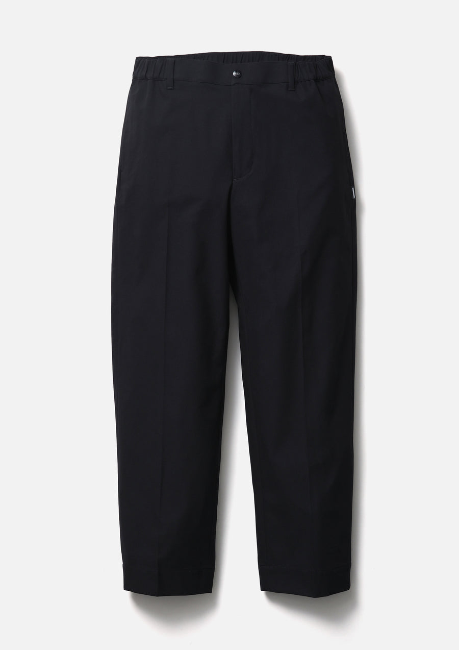 Tapered pants made from polyester chino fabric with a special molecular structure that provides four-way stretch and high durability. The twill fabric features a pronounced diagonal weave, enhanced with a wrinkle finish and water-repellent properties. Designed with an elastic waistband and belt loops. Finished with original snap buttons, zipper pulls, and signature tape. A brand tag is placed on the back flap pocket, with a woven side label at the side seam.